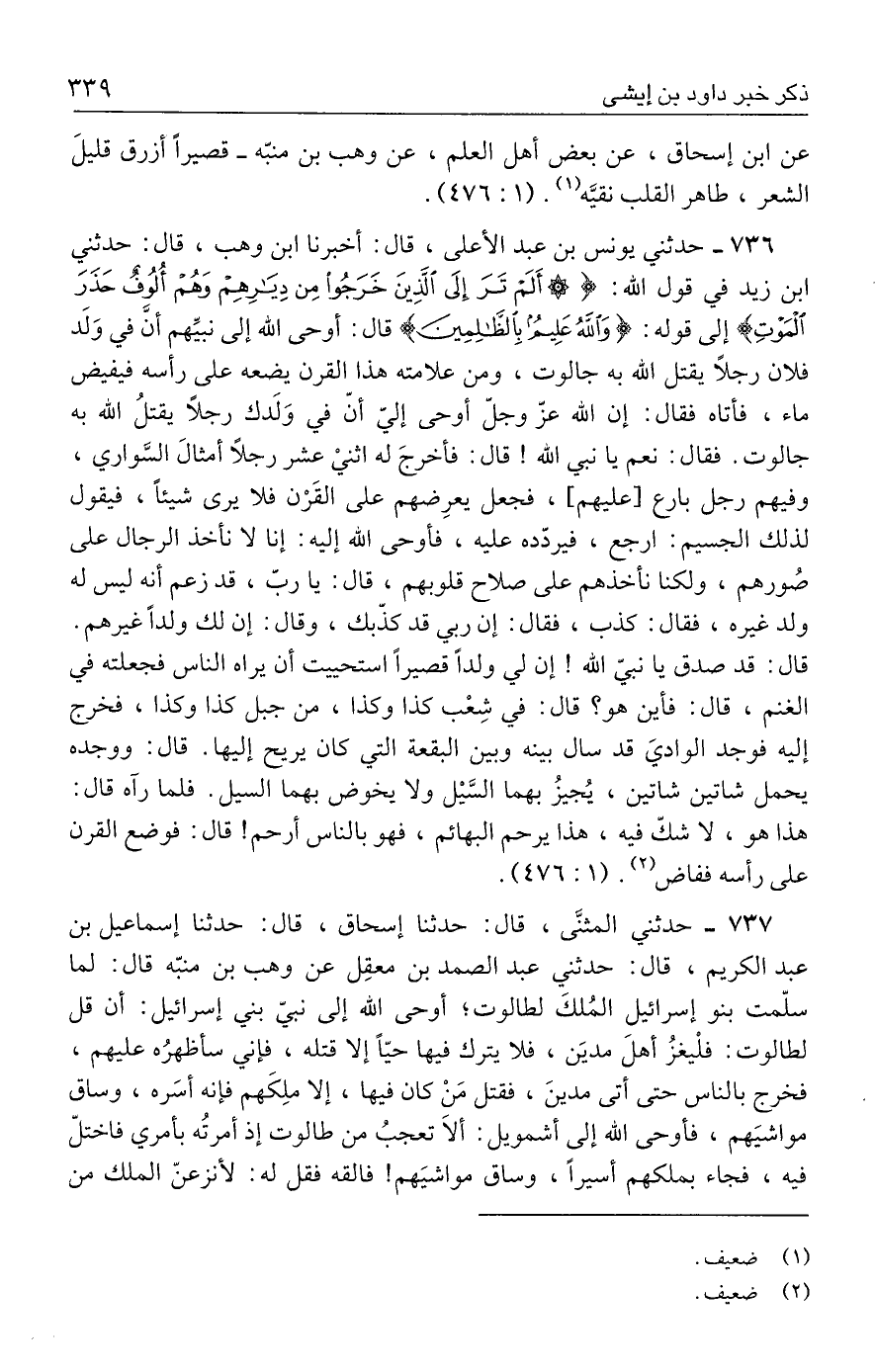 ٧٣٦ - حدثني يونس بن عبد الأعلى، قال: أخبرنا ابن وهب، قال: حدثني ابن زيد في قول الله: {أَلَمْ تَرَ إِلَى الَّذِينَ خَرَجُوا مِنْ دِيَارِهِمْ وَهُمْ أُلُوفٌ حَذَرَ الْمَوْتِ} إلي قوله: {وَاللَّهُ عَلِيمٌ بِالظَّالِمِينَ} قال: أوحي الله إلي نبيِّهم أن في وَلَد فلان رجلًا يقتل الله به جالوت، ومن علامته هذا القرن يضعه علي رأسه فيفيض ماء، فأتاه فقال: إن الله عزّ وجلّ أوحي إليّ أنّ في وَلَدك رجلًا يقتلُ الله به جالوت. فقال: نعم يا نبي الله! قال: فأخرجَ له اثني عشر رجلًا أمثال السَّواري، وفيهم رجل بارع [عليهم]، فجعل يعرِضهم علي القَرْن فلا يري شيئًا، فيقول لذلك الجسيم: ارجع، فيردّده عليه، فأوحي الله إليه: إنا لا نأخذ الرجال علي صُورهم، ولكنا نأخذهم علي صلاح قلوبهم، قال: يا ربّ، قد زعم أنه ليس له ولد غيره، فقال: كذب، فقال: إن ربي قد كذّبك، وقال: إن لك ولدًا غيرهم. قال: قد صدق يا نبيّ الله! إن لي ولدًا قصيرًا استحييت أن يراه الناس فجعلته في الغنم، قال: فأين هو؟ قال: في شِعْب كذا وكذا، من جبل كذا وكذا، فخرج إليه فوجد الواديَ قد سال بينه وبين البقعة التي كان يريح إليها. قال: ووجده يحمل شاتين شاتين، يُجيزُ بهما السَّيل ولا يخوض بهما السيل. فلما رآه قال: هذا هو، لا شكّ فيه، هذا يرحم البهائم، فهو بالناس أرحم! قال: فوضع القرن علي رأسه ففاض (٢). (١: ٤٧٦).