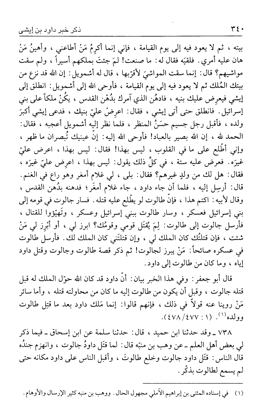 ٧٣٨ - وقد حدثنا ابن حميد، قال: حدثنا سلمة عن ابن إسحاق -فيما ذكر لي بعض أهل العلم- عن وهب بن منبّه قال: لما قتَل داودُ جالوت، وانهزم جندُه قال الناس: قتَل داود جالوت وخلع طالوتَ، وأقبل الناس علي داود مكانه حتى لم يسمع لطالوت بذكْر.