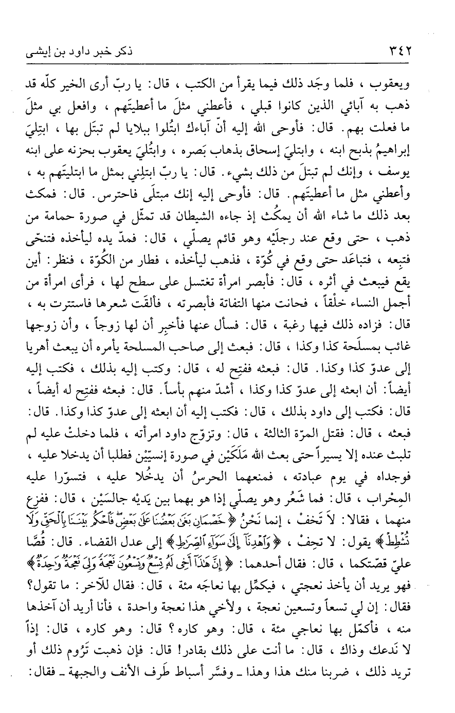 ويعقوب، فلما وجَد ذلك فيما يقرأ من الكتب، قال: يا ربّ أري الخير كلّه قد ذهب به آبائي الذين كانوا قبلي، فأعطني مثلَ ما أعطيتَهم، وافعل بي مثلَ ما فعلت بهم. قال: فأوحي الله إليه أنّ آباءك ابتُلوا ببلايا لم تبتَل بها، ابتِليَ إبراهيمُ بذبح ابنه، وابتليَ إسحاق بذهاب بَصره، وابتُليَ يعقوب بحزنه علي ابنه يوسف، وإنك لم تبتلَ من ذلك بشيء. قال: يا ربّ ابتلِني بمثل ما ابتليتَهم به، وأعطني مثل ما أعطيتَهم. قال: فأوحي إليه إنك مبتلَي فاحترس. قال: فمكث بعد ذلك ما شاء الله أن يمكُث إذ جاءه الشيطان قد تمثّل في صورة حمامة من ذهب، حتى وقع عند رجلَيه وهو قائم يصلّي، قال: فمدّ يده ليأخذه فتنحّي فتبِعه، فتباعَد حتى وقع في كُوّة، فذهب ليأخذه، فطار من الكُوّة، فنظر: أين يقع فيبعث في أثره، قال: فأبصر امرأة تغتسل علي سطح لها، فرأي امرأة من أجمل النساء خلْقًا، فحانت منها التفاتة فأبصرته، فألقَت شعرها فاستترت به، قال: فزاده ذلك فيها رغبة، قال: فسأل عنها فأخبِر أن لها زوجًا، وأن زوجها غائب بمسلَحة كذا وكذا، قال: فبعث إلي صاحب المسلحة يأمره أن يبعث أهريا إلي عدوّ كذا وكذا. قال: فبعثه ففتِح له، قال: وكتب إليه بذلك، فكتب إليه أيضًا: أن ابعثه إلي عدوّ كذا وكذا، أشدّ منهم بأسًا. قال: فبعثه ففتِح له أيضًا، قال: فكتب إلي داود بذلك، قال: فكتب إليه أن ابعثه إلي عدوّ كذا وكذا. قال: فبعثه، قال: فقتل المرّة الثالثة، قال! وتزوّج داود امرأته، فلما دخلتْ عليه لم تلبث عنده إلا يسيرًا حتى بعث الله مَلَكَين في صورة إنسيّين فطلبا أن يدخلا عليه، فوجداه في يوم عبادته، فمنعهما الحرسُ أن يدخُلا عليه، فتسوّرا عليه المِحْراب، قال: فما شَعُر وهو يصلّي إذا هو بهما بين يَديه جالسَين، قال: ففزع منهما، فقالا: لَا تَخفْ، إنما نَحْنُ {خَصْمَانِ بَغَى بَعْضُنَا عَلَى بَعْضٍ فَاحْكُمْ بَينَنَا بِالْحَقِّ وَلَا تُشْطِطْ} يقول: لا تحِفْ، {وَاهْدِنَا إِلَى سَوَاءِ الصِّرَاطِ} إلي عدل القضاء. قال: قُصَّا عليّ قصّتكما، قال: فقال أحدهما: {إِنَّ هَذَا أَخِي لَهُ تِسْعٌ وَتِسْعُونَ نَعْجَةً وَلِيَ نَعْجَةٌ وَاحِدَةٌ} فهو يريد أن يأخذ نعجتي، فيكمِّل بها نعاجَه مئة، قال: فقال للآخر: ما تقول؟ فقال: إن لي تسعًا وتسعين نعجة، ولأخي هذا نعجة واحدة، فأنا أريد أن آخذها منه، فأكمّل بها نعاجي مئة، قال: وهو كاره؟ قال: وهو كاره، قال: إذًا لا نَدعك وذاك، قال: ما أنت علي ذلك بقادر! قال: فإن ذهبت تَرُوم ذلك أو تريد ذلك، ضربنا منك هذا وهذا -وفسَّر أسباط طَرف الأنف والجبهة- فقال: