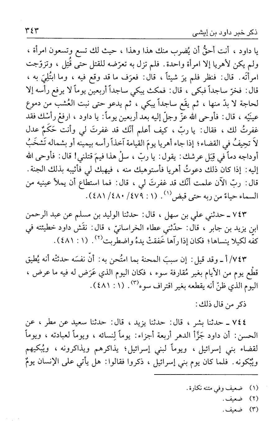 ٧٤٤ - حدثنا بشر، قال: حدثنا يزيد، قال: حدثنا سعيد عن مطر، عن الحسن: أن داود جَزَّأ الدهر أربعة أجزاء: يومًا لِنسائه، ويومًا لعبادته، ويومًا لقضاء بني إسرائيل، ويومًا لبني إسرائيل؛ يذاكرهم ويذاكرونه، ويُبكيهم ويُبْكونه. فلما كان يوم بني إسرائيل، ذكروا فقالوا: هل يأتي علي الإنسان يومٌ
