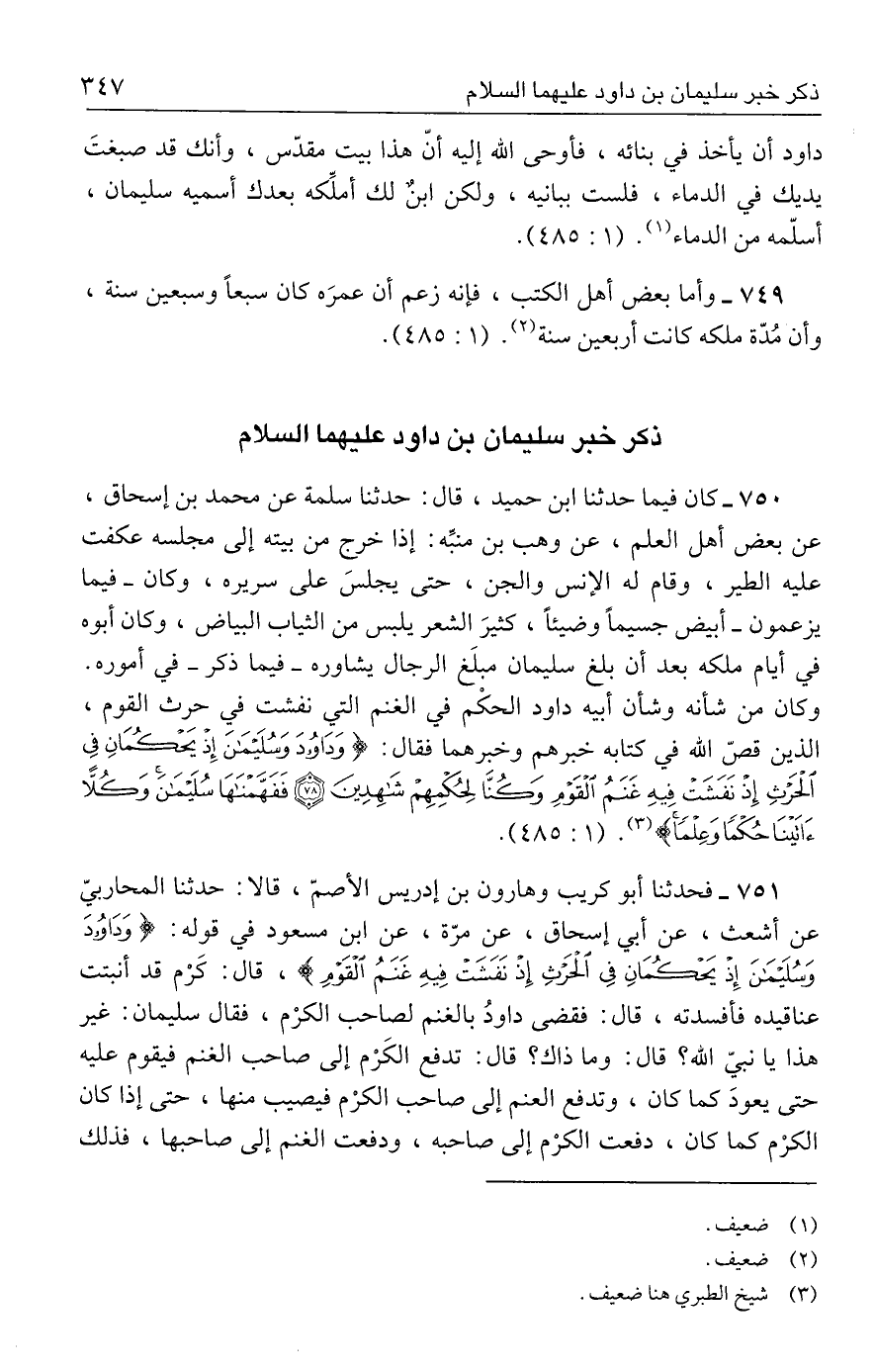 ٧٥٠ - كان فيما حدثنا ابن حميد، قال: حدثنا سلمة عن محمد بن إسحاق، عن بعض أهل العلم، عن وهب بن منبِّه: إذا خرج من بيته إلي مجلسه عكفت عليه الطير، وقام له الإنس والجن، حتى يجلسَ علي سريره، وكان -فيما يزعمون- أبيض جسيمًا وضيئًا، كثيرَ الشعر يلبس من الثياب البياض، وكان أبوه في أيام ملكه بعد أن بلغ سليمان مبلَغ الرجال يشاوره -فيما ذكر- في أموره. وكان من شأنه وشأن أبيه داود الحكْم في الغنم التي نفشت في حرث القوم، الذين قصّ الله في كتابه خبرهم وخبرهما فقال: {وَدَاوُودَ وَسُلَيمَانَ إِذْ يَحْكُمَانِ فِي الْحَرْثِ إِذْ نَفَشَتْ فِيهِ غَنَمُ الْقَوْمِ وَكُنَّا لِحُكْمِهِمْ شَاهِدِينَ (٧٨) فَفَهَّمْنَاهَا سُلَيمَانَ وَكُلًّا آتَينَا حُكْمًا وَعِلْمًا} (٣). (١: ٤٨٥).