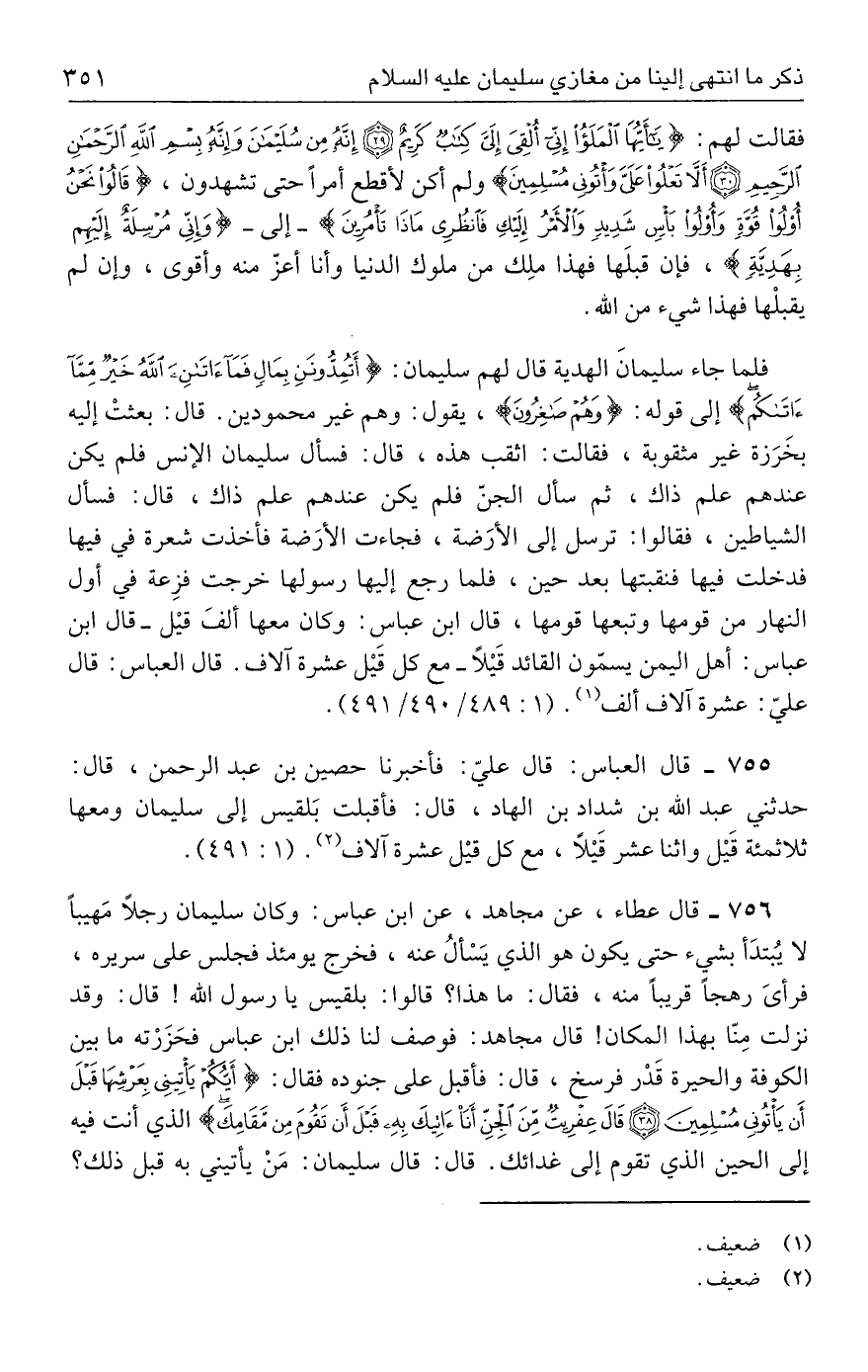 ٧٥٥ - قال العباس: قال عليّ: فأخبرنا حصين بن عبد الرحمن، قال: حدثني عبد الله بن شداد بن الهاد، قال: فأقبلت بَلقيس إلي سليمان ومعها ثلاثمئة قَيل واثنا عشر قَيلًا، مع كل قيل عشرة آلاف (٢). (١: ٤٩١).