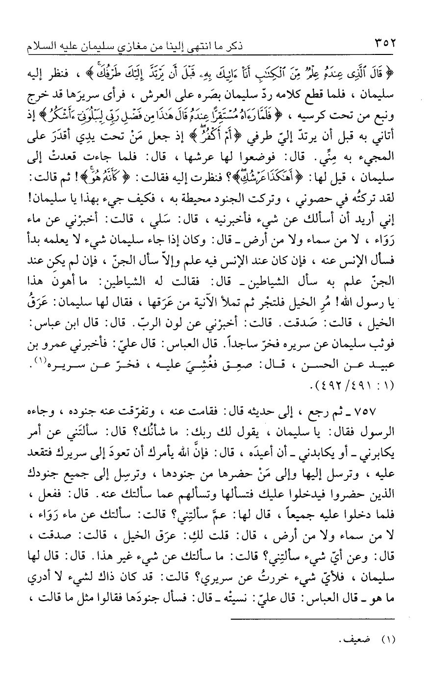٧٥٧ - ثم رجع، إلي حديثه قال: فقامت عنه، وتفرّقت عنه جنوده، وجاءه الرسول فقال: يا سليمان، يقول لك ربك: ما شأنُك؟ قال: سألتَني عن أمر يكابرني -أو يكابدني- أن أعيدَه، قال: فإنَّ الله يأمرك أن تعودَ إلي سريرك فتقعد عليه، وترسل إليها وإلي مَنْ حضرها من جنودها، وترسِل إلي جميع جنودك الذين حضروا فيدخلوا عليك فتسألها وتسألهم عما سألتك عنه. قال: ففعل، فلما دخلوا عليه جميعًا، قال لها: عمَّ سألتِني؟ قالت: سألتك عن ماء رَوَاء، لا من سماء ولا من أرض، قال: قلت لكِ: عرَق الخيل، قالت: صدقت، قال: وعن أبيّ شيء سألتِني؟ قالت: ما سألتك عن شيء غير هذا. قال: قال لها سليمان، فلأيّ شيء خررتُ عن سريري؟ قالت: قد كان ذاك لشيء لا أدري ما هو -قال العباس: قال عليّ: نسيتْه- قال: فسأل جنودَها فقالوا مثل ما قالت،