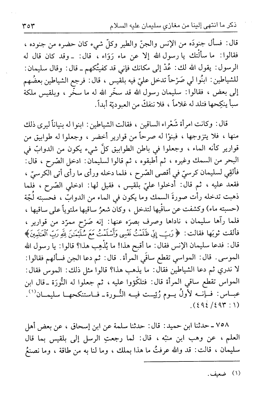 ٧٥٨ - حدثنا ابن حميد: قال: حدثنا سلمة عن ابن إسحاق، عن بعض أهل العلم، عن وهب ابن منبّه، قال: لما رجعتِ الرسل إلي بلقيس بما قال سليمان، قالت: قد والله عرفتُ ما هذا بملك، وما لنا به من طاقة، وما نصنعُ