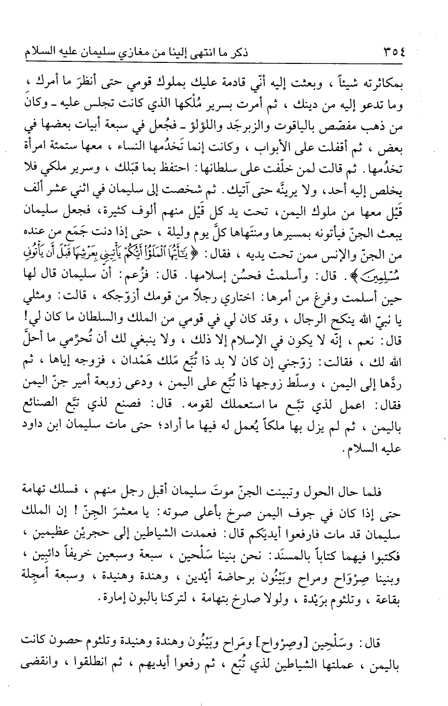 بمكاثرته شيئًا، وبعثت إليه أنّي قادمة عليك بملوك قومي حتى أنظرَ ما أمرك، وما تدعو إليه من دينك، ثم أمرت بسرير مُلْكها الذي كانت تجلس عليه- وكانَ من ذهب مفصّص بالياقوت والزبرجَد واللؤلؤ- فجُعل في سبعة أبيات بعضها في بعض، ثم أقفلت علي الأبواب، وكانت إنما تَخدُمها النساء، معها ستمئة امرأة تخدُمها. ثم قالت لمن خلّفت علي سلطانها: احتفظ بما قبَلك، وسرير ملكي فلا يخلص إليه أحد، ولا يرينَّه حتى آتيك. ثم شخصت إلي سليمان في اثني عشر ألف قَيل معها من ملوك اليمن، تحت يد كل قَيل منهم ألوف كثيرة، فجعل سليمان يبعث الجنّ فيأتونه بمسيرها ومنتَهاها كلَّ يوم وليلة، حتى إذا دنت جَمَع من عنده من الجنّ والإنس ممن تحت يديه، فقال: {يَا أَيُّهَا الْمَلَأُ أَيُّكُمْ يَأْتِينِي بِعَرْشِهَا قَبْلَ أَنْ يَأْتُونِي مُسْلِمِينَ (٣٨)}. قال: وأسلمتْ فحسُن إسلامها. قال: فزُعم: أنّ سليمان قال لها حين أسلمت وفرغ من أمرها: اختاري رجلًا من قومك أزوّجكه، قالت: ومثلي يا نبيّ الله ينكح الرجال، وقد كان لي في قومي من الملك والسلطان ما كان لي! قال: نعم، إنّه لا يكون في الإسلام إلا ذلك، ولا ينبغي لك أن تُحرِّمي ما أحلَّ الله لك، فقالت: زوّجني إن كان لا بد ذا تُبَّع مَلك هَمْدان، فزوجه إياها، ثم ردَّها إلي اليمن، وسلّط زوجها ذا تُبَّع علي اليمن، ودعي زوبعة أمير جنّ اليمن فقال: اعمل لذي تبَّع ما استعملك لقومه. قال: فصنع لذي تبَّع الصنائع باليمن، ثم لم يزل بها ملكًا يُعمل له فيها ما أراد؛ حتى مات سليمان ابن داود - عليه السلام -.