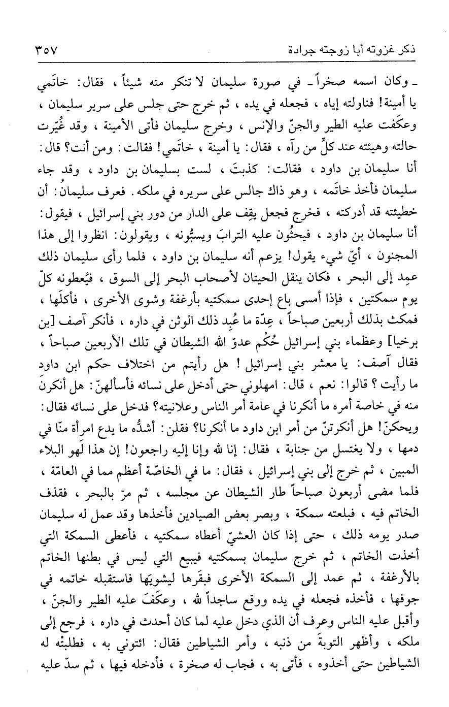 -وكان اسمه صخرًا- في صورة سليمان لا تنكر منه شيئًا، فقال: خاتَمي يا أمينة! فناولته إياه، فجعله في يده، ثم خرج حتى جلس علي سرير سليمان، وعكَفت عليه الطير والجنّ والإنس، وخرج سليمان فأتي الأمينة، وقد غُيّرت حالته وهيئته عند كلِّ من رآه، فقال: يا أمينة، خاتَمي! فقالت: ومن أنت؟ قال: أنا سليمان بن داود، فقالت: كذبتَ، لست بسليمان بن داود، وقد جاء سليمان فأخذ خاتَمه، وهو ذاك جالس علي سريره في ملكه. فعرف سليمانُ: أن خطيئته قد أدركته، فخرج فجعل يقِف علي الدار من دور بني إسرائيل، فيقول: أنا سليمان بن داود، فيحثُون عليه الترابَ ويسبُّونه، ويقولون: انظروا إلي هذا المجنون، أيّ شيء يقول! يزعم أنه سليمان بن داود، فلما رأي سليمان ذلك عمِد إلي البحر، فكان ينقل الحيتان لأصحاب البحر إلي السوق، فيُعطونه كلّ يوم سمكتين، فإذا أمسي باع إحدي سمكتيه بأرغفة وشوي الأخرى، فأكلَها، فمكث بذلك أربعين صباحًا، عِدّة ما عُبِد ذلك الوثن في داره، فأنكر آصف [بن برخيا] وعظماء بني إسرائيل حُكْم عدوّ الله الشيطان في تلك الأربعين صباحًا، فقال آصف: يا معشر بني إسرائيل! هل رأيتم من اختلاف حكم ابن داود ما رأيت؟ قالوا: نعم، قال: امهلوني حتى أدخل علي نسائه فأسألهنّ: هل أنكرنَ منه في خاصة أمره ما أنكرنا في عامة أمر الناس وعلانيته؟ فدخل علي نسائه فقال: ويحكنّ! هل أنكرتنّ من أمر ابن داود ما أنكرنا؟ فقلن: أشدُّه ما يدع امرأة منّا في دمها، ولا يغتسل من جنابة، فقال: إنا لله وإنا إليه راجعون! إن هذا لَهو البلاء المبين، ثم خرج إلي بني إسرائيل، فقال: ما في الخاصّة أعظم مما في العامّة، فلما مضي أربعون صباحًا طار الشيطان عن مجلسه، ثم مرّ بالبحر، فقذف الخاتم فيه، فبلعته سمكة، وبصر بعض الصيادين فأخذها وقد عمل له سليمان صدر يومه ذلك، حتى إذا كان العشيّ أعطاه سمكتيه، فأعطي السمكة التي أخذت الخاتم، ثم خرج سليمان بسمكتيه فيبيع التي ليس في بطنها الخاتم بالأرغفة، ثم عمد إلي السمكة الأخرى فبقَرها ليشويَها فاستقبله خاتمه في جوفها، فأخذه فجعله في يده ووقع ساجدًا لله، وعكَفَ عليه الطير والجنّ، وأقبل عليه الناس وعرف أن الذي دخل عليه لما كان أحدث في داره، فرجع إلي ملكه، وأظهر التوبةَ من ذنبه، وأمر الشياطين فقال: ائتوني به، فطلبتْه له الشياطين حتى أخذوه، فأتي به، فجاب له صخرة، فأدخله فيها، ثم سدّ عليه
