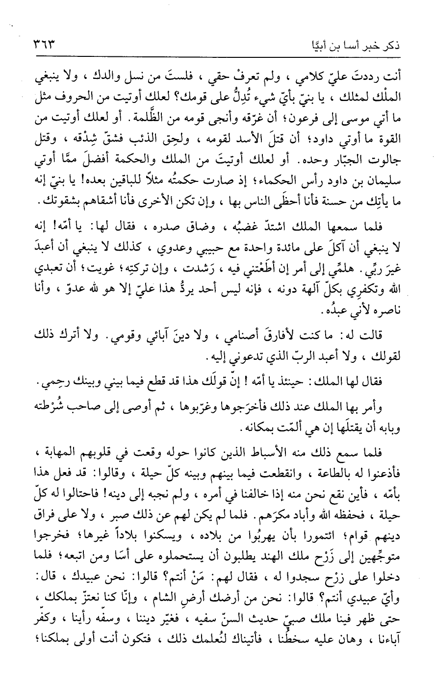 أنت رددتَ عليّ كلامي، ولم تعرفْ حقي، فلستَ من نسل والدك، ولا ينبغي الملْك لمثلك، يا بنيّ بأيّ شيء تُدِلُّ علي قومك؟ لعلك أوتيت من الحروف مثل ما أتي موسى إلي فرعون؛ أن غرّقه وأنجي قومه من الظَّلمة. أو لعلك أوتيت من القوة ما أوتي داود؛ أن قتلَ الأسد لقومه، ولحِق الذئب فشقّ شِدْقه، وقتل جالوت الجبّار وحده. أو لعلك أوتيتَ من الملك والحكمة أفضلَ ممَّا أوتي سليمان بن داود رأس الحكماء؛ إذ صارت حكمتُه مثلًا للباقين بعده! يا بنيّ إنه ما يأتِك من حسنة فأنا أحظَي الناس بها، وإن تكن الأخرى فأنا أشقاهم بشقوتك.