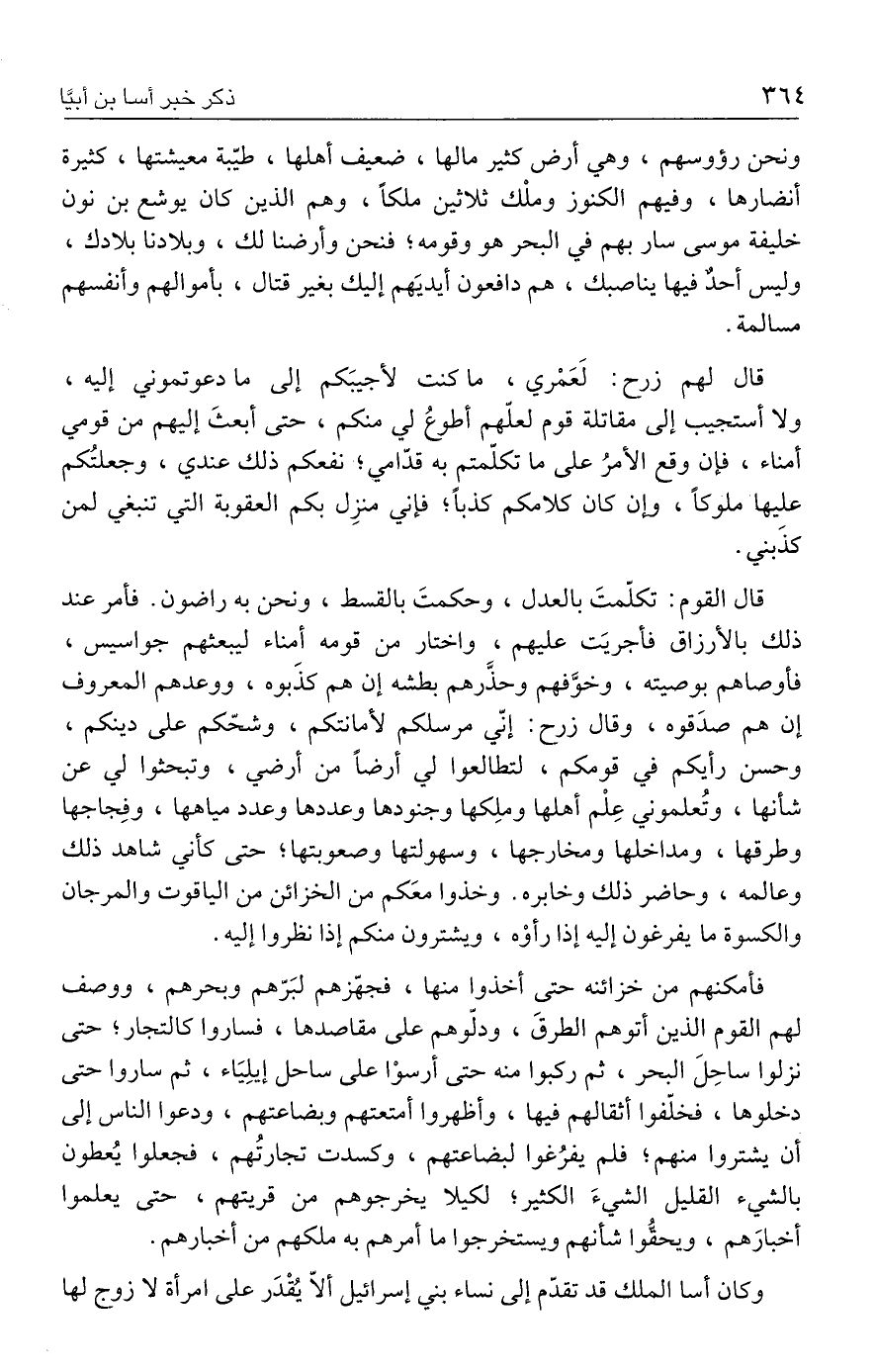 قال لهم زرح: لَعَمْري، ما كنت لأجيبَكم إلي ما دعوتموني إليه، ولا أستجيب إلي مقاتلة قوم لعلّهم أطوعُ لي منكم، حتى أبعثَ إليهم من قومي أمناء، فإن وقع الأمرُ علي ما تكلّمتم به قدّامي؛ نفعكم ذلك عندي، وجعلتُكم عليها ملوكًا، وإن كان كلامكم كذبًا؛ فإني منزِل بكم العقوبة التي تنبغي لمن كذَبني.