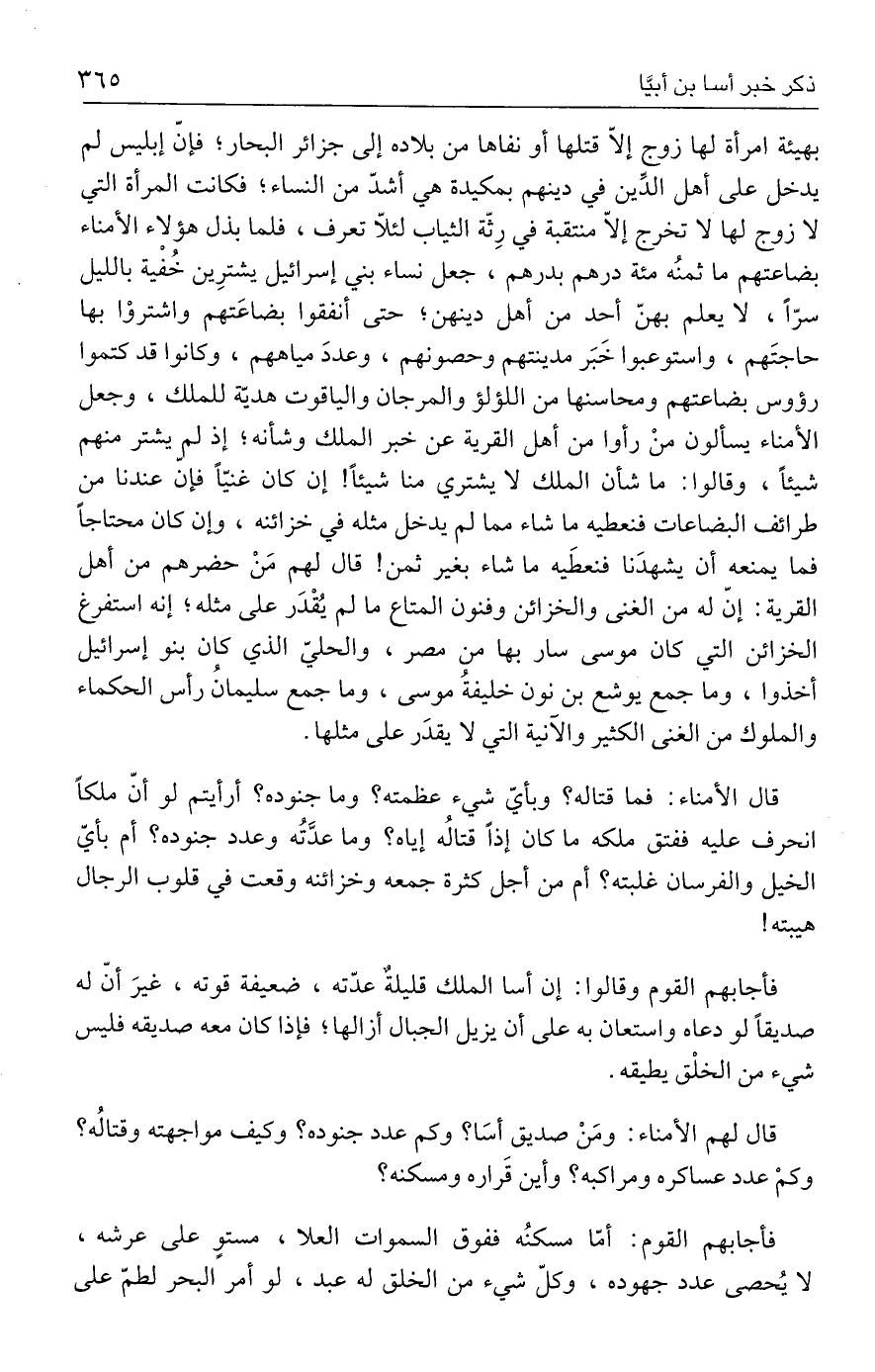 بهيئة امرأة لها زوج إلّا قتلها أو نفاها من بلاده إلي جزائر البحار؛ فإنّ إبليس لم يدخل علي أهل الدِّين في دينهم بمكيدة هي أشدّ من النساء؛ فكانت المرأة التي لا زوج لها لا تخرج إلّا منتقبة في رِثّة الثياب لئلّا تعرف، فلما بذل هؤلاء الأمناء بضاعتهم ما ثمنُه مئة درهم بدرهم، جعل نساء بني إسرائيل يشترِين خُفْية بالليل سرًّا، لا يعلم بهنّ أحد من أهل دينهن؛ حتى أنفقوا بضاعَتهم واشتروْا بها حاجتَهم، واستوعبوا خَبَر مدينتهم وحصونهم، وعددَ مياههم، وكانوا قد كتموا رؤوس بضاعتهم ومحاسنها من اللؤلؤ والمرجان والياقوت هديّة للملك، وجعل الأمناء يسألون منْ رأوا من أهل القرية عن خبر الملك وشأنه؛ إذ لم يشتر منهم شيئًا، وقالوا: ما شأن الملك لا يشتري منا شيئًا! إن كان غنيًّا فإنّ عندنا من طرائف البضاعات فنعطيه ما شاء مما لم يدخل مثله في خزائنه، وإن كان محتاجًا فما يمنعه أن يشهدَنا فنعطَيه ما شاء بغير ثمن! قال لهم مَنْ حضرهم من أهل القرية: إنّ له من الغني والخزائن وفنون المتاع ما لم يُقْدَر علي مثله؛ إنه استفرغ الخزائن التي كان موسى سار بها من مصر، والحليّ الذي كان بنو إسرائيل أخذوا، وما جمع يوشع بن نون خليفةُ موسى، وما جمع سليمانُ رأس الحكماء والملوك من الغني الكثير والآنية التي لا يقدَر علي مثلها.