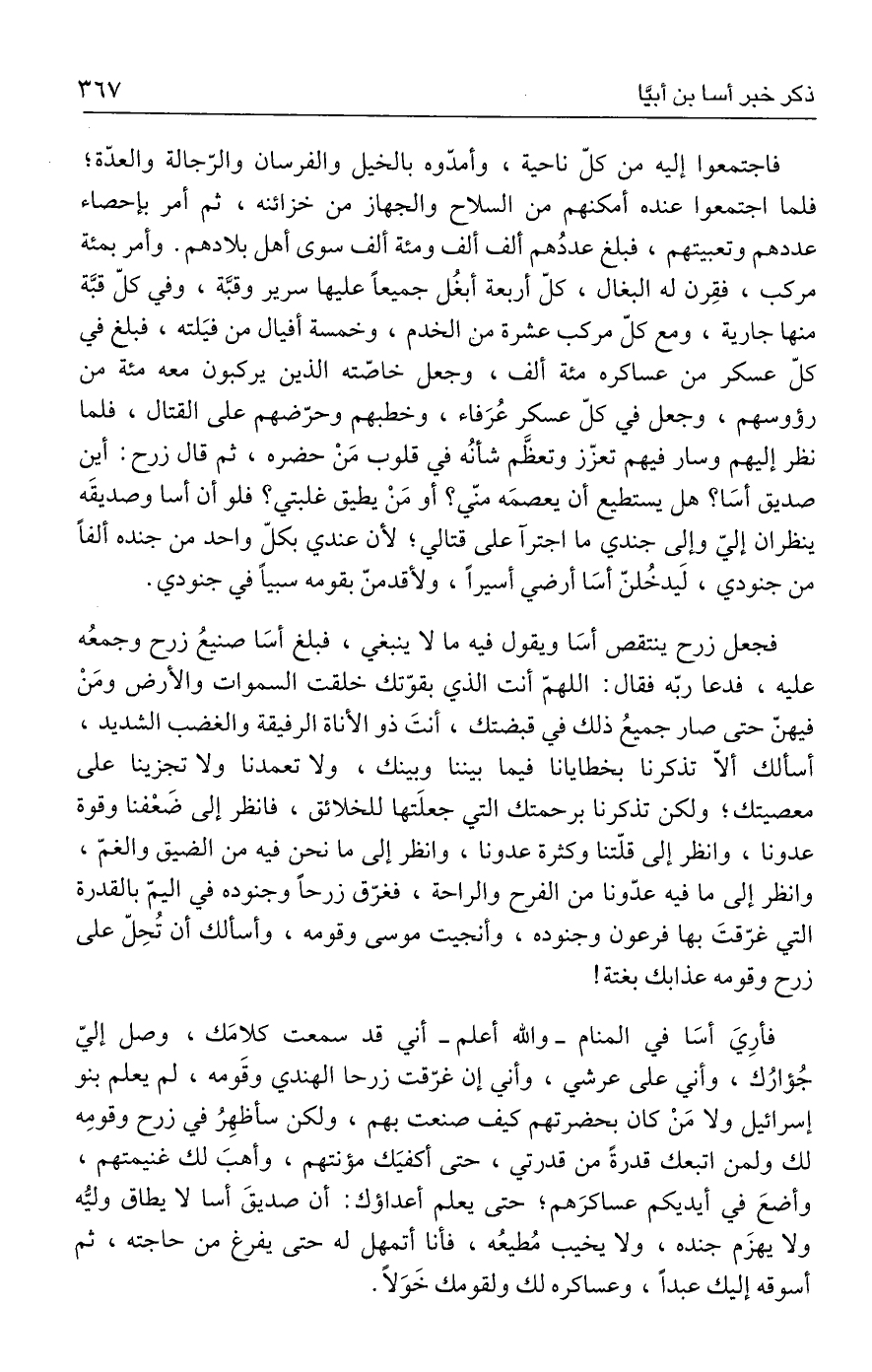فأرِيَ أسَا في المنام -والله أعلم- أني قد سمعت كلامَك، وصل إليّ جُؤارُك، وأني علي عرشي، وأني إن غرّقت زرحا الهندي وقَومه، لم يعلم بنو إسرائيل ولا مَنْ كان بحضرتهم كيف صنعت بهم، ولكن سأظهِرُ في زرح وقومِه لك ولمن اتبعك قدرةً من قدرتي، حتى أكفيَك مؤنتهم، وأهبَ لك غنيمتهم، وأضعَ في أيديكم عساكرَهم؛ حتى يعلم أعداؤك: أن صديقَ أسا لا يطاق وليُّه ولا يهزَم جنده، ولا يخيب مُطيعُه، فأنا أتمهل له حتى يفرغ من حاجته، ثم أسوقه إليك عبدًا، وعساكره لك ولقومك خَوَلًا.