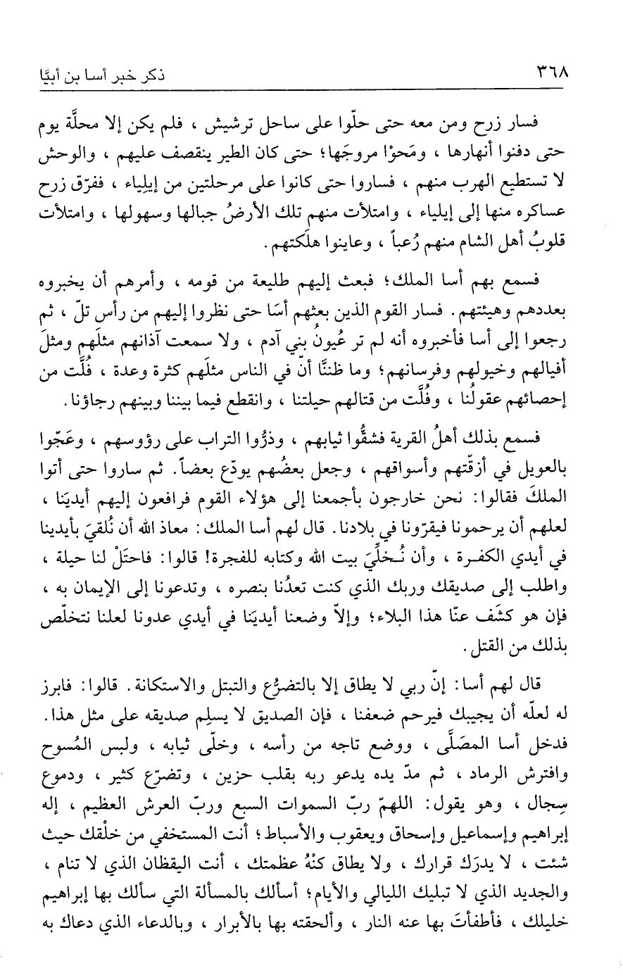 قال لهم أسا: إنّ ربي لا يطاق إلا بالتضرُّع والتبتل والاستكانة. قالوا: فابرز له لعلّه أن يجيبك فيرحم ضعفنا، فإن الصديق لا يسلِم صديقه علي مثل هذا. فدخل أسا المصَلَّي، ووضع تاجه من رأسه، وخلّي ثيابه، ولبس المُسوح وافترش الرماد، ثم مدّ يده يدعو ربه بقلب حزين، وتضرّع كثير، ودموع سِجال، وهو يقول: اللهمّ ربّ السموات السبع وربّ العرش العظيم، إله إبراهيم وإسماعيل وإسحاق ويعقوب والأسباط؛ أنت المستخفي من خلْقك حيث شئت، لا يدرَك قرارك، ولا يطاق كنْهُ عظمتك، أنت اليقظان الذي لا تنام، والجديد الذي لا تبليك الليالي والأيام؛ أسألك بالمسألة التي سألك بها إبراهيم خليلك، فأطفأتَ بها عنه النار، وألحقته بها بالأبرار، وبالدعاء الذي دعاك به