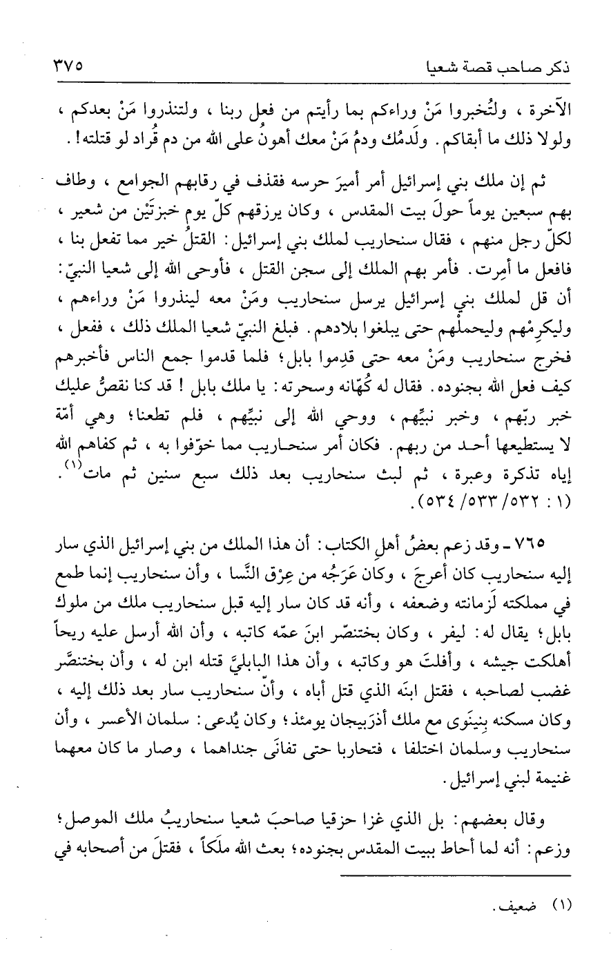 ٧٦٥ - وقد زعم بعضُ أهلِ الكتاب: أن هذا الملك من بني إسرائيل الذي سار إليه سنحاريب كان أعرجَ، وكان عَرَجُه من عِرْق النَّسا، وأن سنحاريب إنما طمع في مملكته لَزمانته وضعفه، وأنه قد كان سار إليه قبل سنحاريب ملك من ملوك بابل؛ يقال له: ليفر، وكان بختنصّر ابنَ عمّه كاتبه، وأن الله أرسل عليه ريحًا أهلكت جيشه، وأفلتَ هو وكاتبه، وأن هذا البابليَّ قتله ابن له، وأن بختنصَّر غضب لصاحبه، فقتل ابنَه الذي قتل أباه، وأنّ سنحاريب سار بعد ذلك إليه، وكان مسكنه بِنينَوى مع ملك أذرَبيجان يومئذ؛ وكان يُدعى: سلمان الأعسر، وأن سنحاريب وسلمان اختلفا، فتحاربا حتى تفانَى جنداهما، وصار ما كان معهما غنيمة لبني إسرائيل.