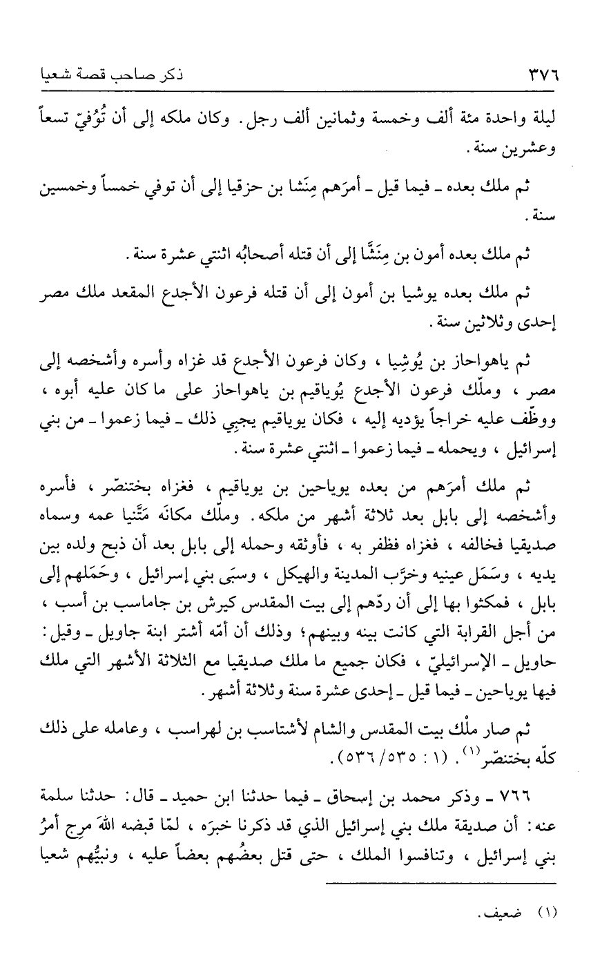 ٧٦٦ - وذكر محمد بن إسحاق -فيما حدثنا ابن حميد- قال: حدثنا سلمة عنه: أن صديقة ملك بني إسرائيل الذي قد ذكرنا خبرَه، لمّا قبضه اللهَ مرِج أمرُ بني إسرائيل، وتنافسوا الملك، حتى قتل بعضُهم بعضًا عليه، ونبيُّهم شعيا