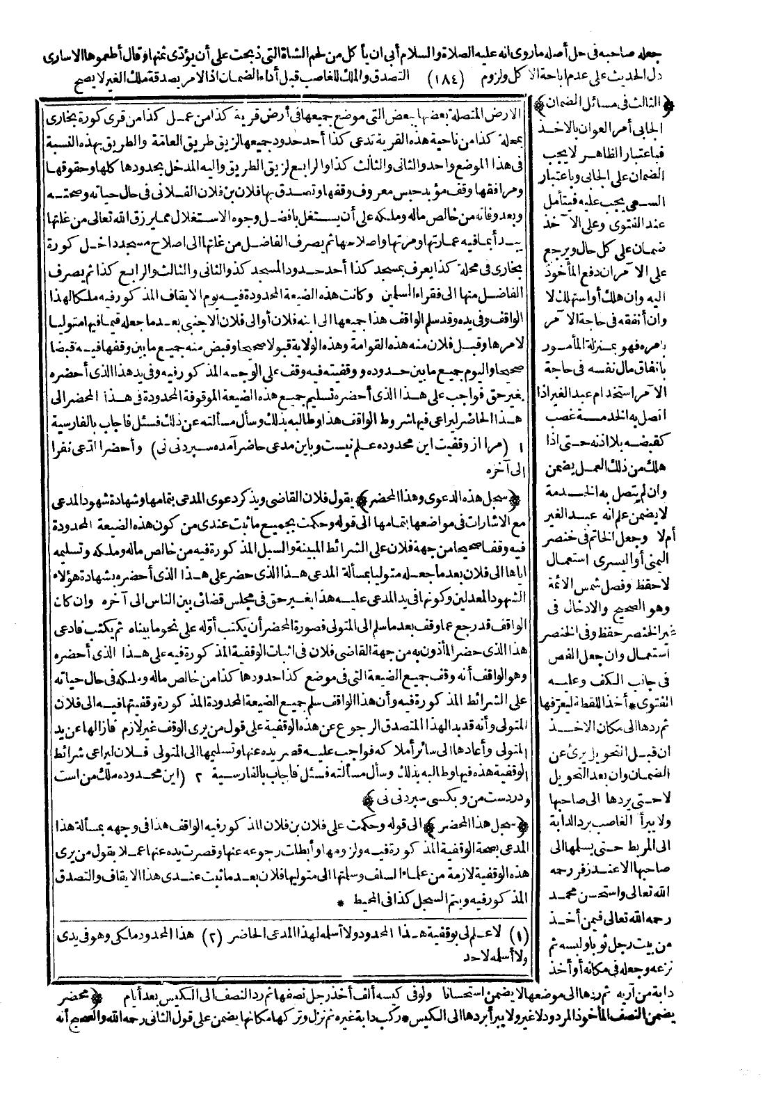 الْأَرْضِ الْمُتَّصِلَةِ بَعْضُهَا بِبَعْضٍ الَّتِي مَوْضِعُ جَمِيعِهَا فِي أَرْضِ قَرْيَةِ كَذَا مِنْ عَمَلِ كَذَا مِنْ قُرَى كُورَةِ بُخَارَى بِمَحَلَّةِ كَذَا مِنْ نَاحِيَةِ هَذِهِ الْقَرْيَةِ تُدْعَى كَذَا أَحَدُ حُدُودِ جَمِيعِهَا لَزِيقُ طَرِيقِ الْعَامَّةِ وَالطَّرِيقُ بِهَذِهِ النِّسْبَةِ فِي هَذَا الْمَوْضِعِ وَاحِدٌ وَالثَّانِي وَالثَّالِثُ كَذَا وَالرَّابِعُ لَزِيقُ الطَّرِيقِ وَإِلَيْهِ الْمَدْخَلُ بِحُدُودِهَا كُلِّهَا وَحُقُوقِهَا وَمَرَافِقِهَا وَقْفٌ مُؤَبَّدٌ حَبْسٌ مَعْرُوفٌ وَقْفُهَا، وَتَصَدَّقَ بِهَا فُلَانُ بْنُ فُلَانٍ الْفُلَانِيِّ فِي حَالِ حَيَاتِهِ وَصِحَّتِهِ وَبَعْدَ وَفَاتِهِ مِنْ خَالِصِ مَالِهِ وَمِلْكِهِ عَلَى أَنْ يَسْتَغِلَّ بِأَفْضَلِ وُجُوهِ الِاسْتِغْلَالِ مِمَّا يَرْزُقُ اللَّهُ تَعَالَى مِنْ غَلَّتِهَا يَبْدَأُ بِمَا فِيهِ عِمَارَتُهَا وَمَرَمَّتُهَا وَإِصْلَاحُهَا ثُمَّ يَصْرِفُ الْفَاضِلَ مِنْ غَلَّتِهَا إلَى إصْلَاحِ مَسْجِدٍ دَاخِلِ كُورَةِ بُخَارَى فِي مَحَلَّةِ كَذَا، يُعْرَفُ بِمَسْجِدِ كَذَا أَحَدُ حُدُودِ الْمَسْجِدِ كَذَا وَالثَّانِي وَالثَّالِثُ وَالرَّابِعُ كَذَا ثُمَّ يَصْرِفُ الْفَاضِلَ مِنْهَا إلَى فُقَرَاءِ الْمُسْلِمِينَ.