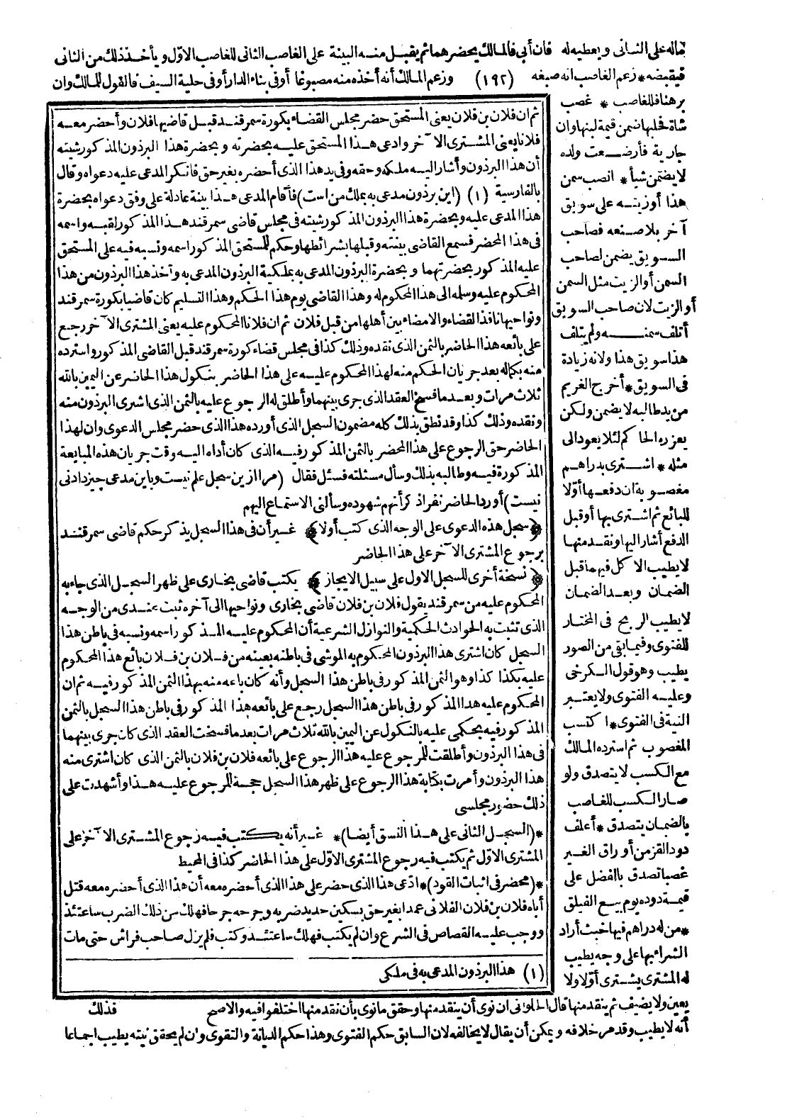 وَذَلِكَ كَذَا، وَقَدْ نَطَقَ بِذَلِكَ كُلِّهِ مَضْمُونُ السِّجِلِّ الَّذِي أَوْرَدَهُ هَذَا الَّذِي حَضَرَ مَجْلِسَ الدَّعْوَى، وَإِنَّ لِهَذَا الْحَاضِرَ حَقَّ الرُّجُوعِ عَلَى هَذَا الْمُحْضَرِ بِالثَّمَنِ الْمَذْكُورِ فِيهِ الَّذِي كَانَ أَدَّاهُ إلَيْهِ وَقْتَ جَرَيَانِ هَذِهِ الْمُبَايَعَةِ الْمَذْكُورَةِ فِيهِ وَطَالَبَهُ بِذَلِكَ وَسَأَلَ مَسْأَلَتَهُ، فَسُئِلَ فَقَالَ (مراازين سِجِلّ عِلْم نِيسَتْ وَبَايَنَ مُدَّعِي جيزدادني نِيسَتْ) أَوْرَدَ الْحَاضِرُ نَفَرًا ذَكَرَ أَنَّهُمْ شُهُودُهُ وَسَأَلَنِي الِاسْتِمَاعَ إلَيْهِمْ (سِجِلُّ هَذِهِ الدَّعْوَى عَلَى الْوَجْهِ الَّذِي كُتِبَ أَوَّلًا) غَيْرَ أَنَّ فِي هَذَا السِّجِلِّ يَذْكُرُ حُكْمَ قَاضِي سَمَرْقَنْدَ بِرُجُوعِ الْمُشْتَرِي الْآخَرِ عَلَى هَذَا الْحَاضِرِ، (نُسْخَةٌ أُخْرَى لِلسِّجِلِّ الْأَوَّلِ عَلَى سَبِيلِ الْإِيجَازِ) يَكْتُبُ قَاضِي بُخَارَى عَلَى ظَهْرِ السِّجِلِّ الَّذِي جَاءَ بِهِ الْمَحْكُومُ عَلَيْهِ مِنْ سَمَرْقَنْدَ يَقُولُ فُلَانُ بْنُ فُلَانٍ قَاضِي بُخَارَى وَنَوَاحِيهَا إلَى آخِرِهِ: ثَبَتَ عِنْدِي مِنْ الْوَجْهِ الَّذِي تَثْبُتُ بِهِ الْحَوَادِثُ الْحُكْمِيَّةُ وَالنَّوَازِلُ الشَّرْعِيَّةُ أَنَّ الْمَحْكُومَ عَلَيْهِ الْمَذْكُورَ اسْمُهُ وَنَسَبُهُ فِي بَاطِنِ هَذَا السِّجِلِّ كَانَ اشْتَرَى هَذَا الْبِرْذَوْنَ الْمَحْكُومَ بِهِ الْمُوَشَّى فِي بَاطِنِهِ بِعَيْنِهِ مِنْ فُلَانِ بْنِ فُلَانٍ بَائِعِ هَذَا الْمَحْكُومِ عَلَيْهِ بِكَذَا كَذَا وَهُوَ الثَّمَنُ الْمَذْكُورُ فِي بَاطِنِ هَذَا السِّجِلِّ، وَأَنَّهُ كَانَ بَاعَهُ مِنْهُ بِهَذَا الثَّمَنِ الْمَذْكُورِ فِيهِ.