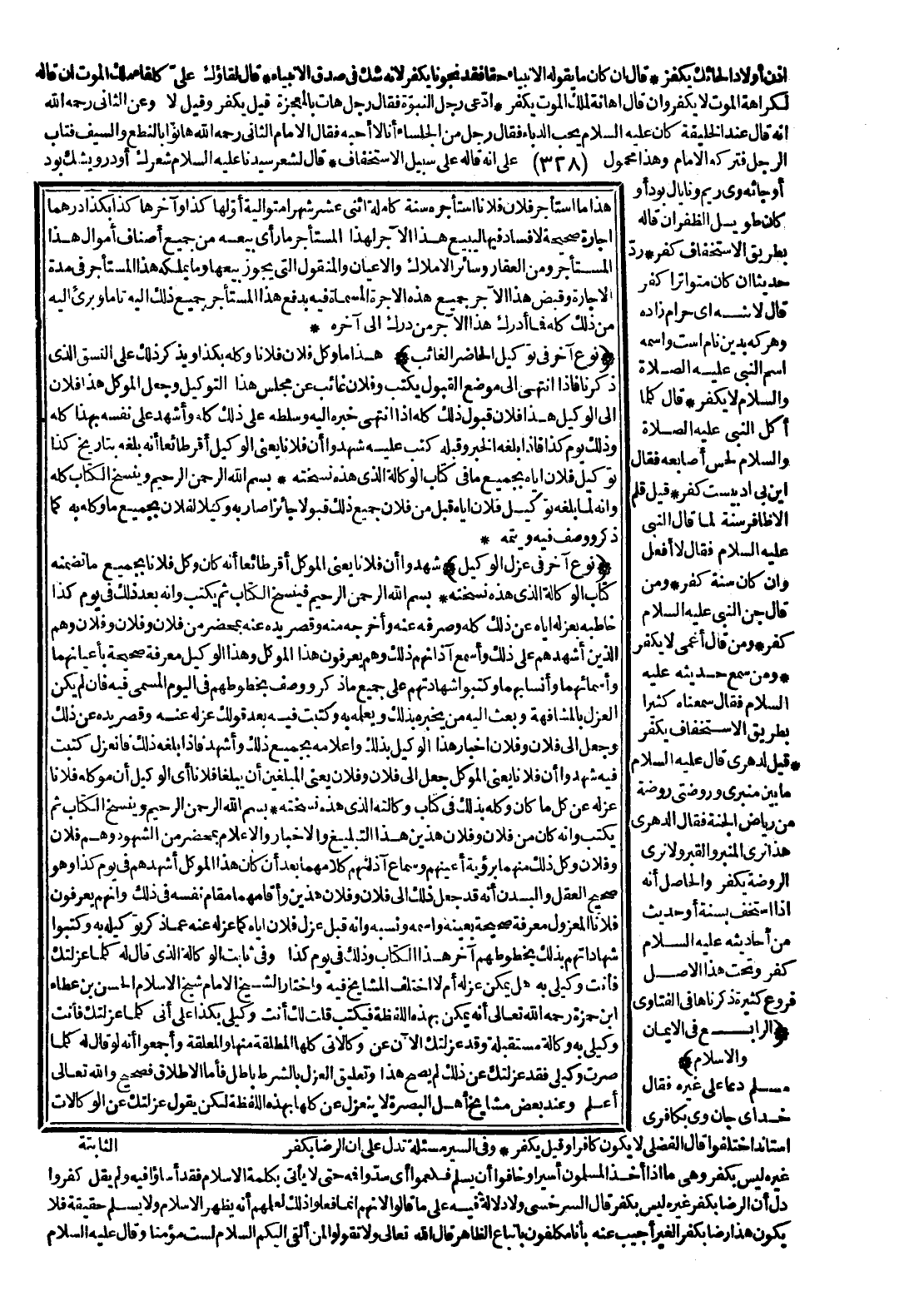 (نَوْعٌ آخَرُ فِي عَزْلِ الْوَكِيلِ) شَهِدُوا أَنَّ فُلَانًا - يَعْنِي الْمُوَكِّلَ - أَقَرَّ طَائِعًا أَنَّهُ كَانَ وَكَّلَ فُلَانًا بِجَمِيعِ مَا تَضَمَّنَهُ كِتَابُ الْوَكَالَةِ الَّذِي هَذِهِ نُسْخَتُهُ بِسْمِ اللَّهِ الرَّحْمَنِ الرَّحِيمِ فَيَنْسَخُ الْكِتَابَ ثُمَّ يَكْتُبُ: وَأَنَّهُ بَعْدَ ذَلِكَ فِي يَوْمِ كَذَا خَاطَبَهُ بِعَزْلِهِ إيَّاهُ عَنْ ذَلِكَ كُلِّهِ وَصَرْفِهِ عَنْهُ وَأَخْرَجَهُ مِنْهُ وَقَصَرَ يَدَهُ عَنْهُ بِمَحْضَرٍ مِنْ فُلَانٍ وَفُلَانٍ وَفُلَانٍ وَهُمْ الَّذِينَ أَشْهَدَهُمْ عَلَى ذَلِكَ وَأَسْمَعَ آذَانَهُمْ ذَلِكَ وَهُمْ يَعْرِفُونَ هَذَا الْمُوَكِّلَ وَهَذَا الْوَكِيلَ مَعْرِفَةً صَحِيحَةً بِأَعْيَانِهِمَا وَأَسْمَائِهِمَا وَأَنْسَابِهِمَا وَكَتَبُوا شَهَادَتَهُمْ عَلَى جَمِيعِ مَا ذُكِرَ وَوُصِفَ بِخُطُوطِهِمْ فِي الْيَوْمِ الْمُسَمَّى فِيهِ فَإِنْ لَمْ يَكُنْ الْعَزْلُ بِالْمُشَافَهَةِ وَبَعَثَ إلَيْهِ مَنْ يُخْبِرُهُ بِذَلِكَ وَيُعْلِمُهُ بِهِ وَكَتَبْتَ فِيهِ بَعْدَ قَوْلِكَ: عَزْلُهُ عَنْهُ وَقَصَرَ يَدَهُ عَنْ ذَلِكَ وَجَعَلَ إلَى فُلَانٍ وَفُلَانٍ إخْبَارَ هَذَا الْوَكِيلِ بِذَلِكَ وَإِعْلَامَهُ بِجَمِيعِ ذَلِكَ وَأَشْهَدَ فَإِذَا بَلَغَهُ ذَلِكَ فَانْعَزَلَ كَتَبْتَ فِيهِ: شَهِدُوا أَنَّ فُلَانًا - يَعْنِي الْمُوَكِّلَ - جَعَلَ إلَى فُلَانٍ وَفُلَانٍ - يَعْنِي الْمُبَلِّغَيْنِ - أَنْ يُبَلِّغَا فُلَانًا - أَيْ الْوَكِيلَ - أَنَّ مُوَكِّلَهُ فُلَانًا عَزَلَهُ عَنْ كُلِّ مَا كَانَ وَكَّلَهُ بِذَلِكَ فِي كِتَابِ وَكَالَتِهِ الَّذِي هَذِهِ نُسْخَتُهُ.