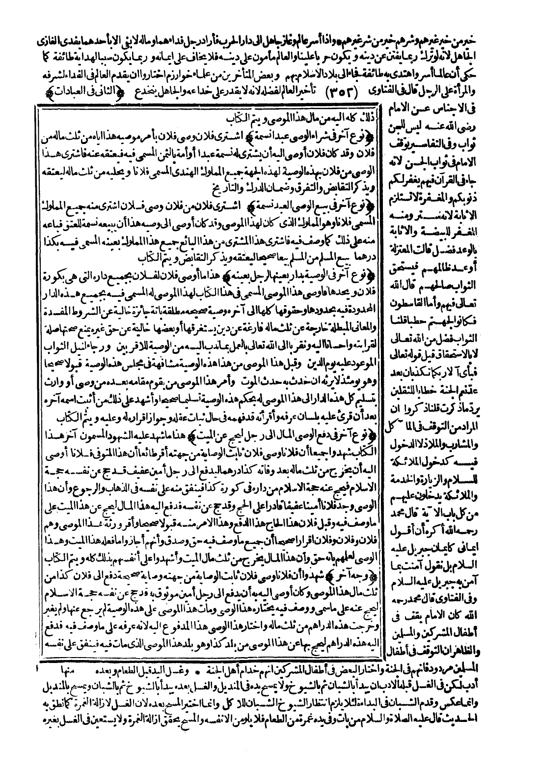 (نَوْعٌ آخَرُ فِي شِرَاءِ الْوَصِيِّ عَبْدًا نَسَمَةً) اشْتَرَى فُلَانٌ وَصِيُّ فُلَانٍ بِأَمْرِ مُوصِيهِ هَذَا إيَّاهُ مِنْ ثُلُثِ مَالِهِ مِنْ فُلَانٍ وَقَدْ كَانَ فُلَانٌ أَوْصَى إلَيْهِ أَنْ يَشْتَرِيَ لَهُ نَسَمَةً عَبْدًا أَوْ أَمَةً بِالثَّمَنِ الْمُسَمَّى فِيهِ فَيَعْتِقَهُ عَنْهُ فَاشْتَرَى هَذَا الْوَصِيُّ مِنْ فُلَانٍ بِهَذِهِ الْوَصِيَّةِ لِهَذِهِ الْجِهَةِ جَمِيعَ الْمَمْلُوكِ الْهِنْدِيِّ الْمُسَمَّى فُلَانًا وَيُحَلِّيهِ مِنْ ثُلُثِ مَالِهِ لِيَعْتِقَهُ وَيَذْكُرُ التَّقَابُضَ وَالتَّفَرُّقَ وَضَمَانَ الدَّرْكِ وَالتَّارِيخَ.