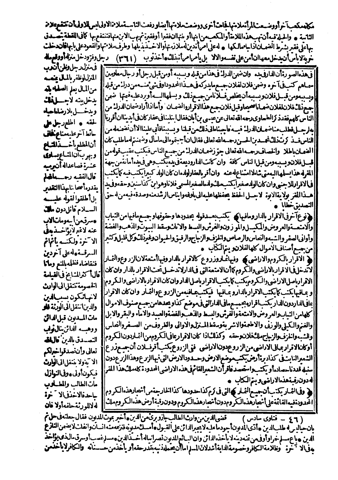 (نَوْعٌ آخَرُ فِي الْإِقْرَارِ بِالدَّارِ وَمَا فِيهَا) يَكْتُبُ بَعْدَ قَوْلِهِ بِحُدُودِهَا وَحُقُوقِهَا وَجَمِيعِ مَا فِيهَا مِنْ الثِّيَابِ وَالْأَمْتِعَةِ وَالْعُرُوضِ وَالْمَكِيلِ وَالْمَوْزُونِ وَالْفُرُشِ وَالْبُسُطِ وَالْأَثَاثِ وَسِقْطِ الْبُيُوتِ وَالذَّهَبِ وَالْفِضَّةِ وَأَوَانِي الصُّفْرِ وَالشَّبَهِ وَالنُّحَاسِ وَالرَّصَاصِ وَالْخَزَفِ وَالزُّجَاجِ وَالرَّقِيقِ وَالْحَيَوَانِ وَغَيْرِ ذَلِكَ وَكُلِّ قَلِيلٍ وَكَثِيرٍ مِنْ جَمِيعِ أَصْنَافِ الْأَمْوَالِ كُلِّهَا لِفُلَانٍ، وَيُتِمُّ الْكِتَابَ.
