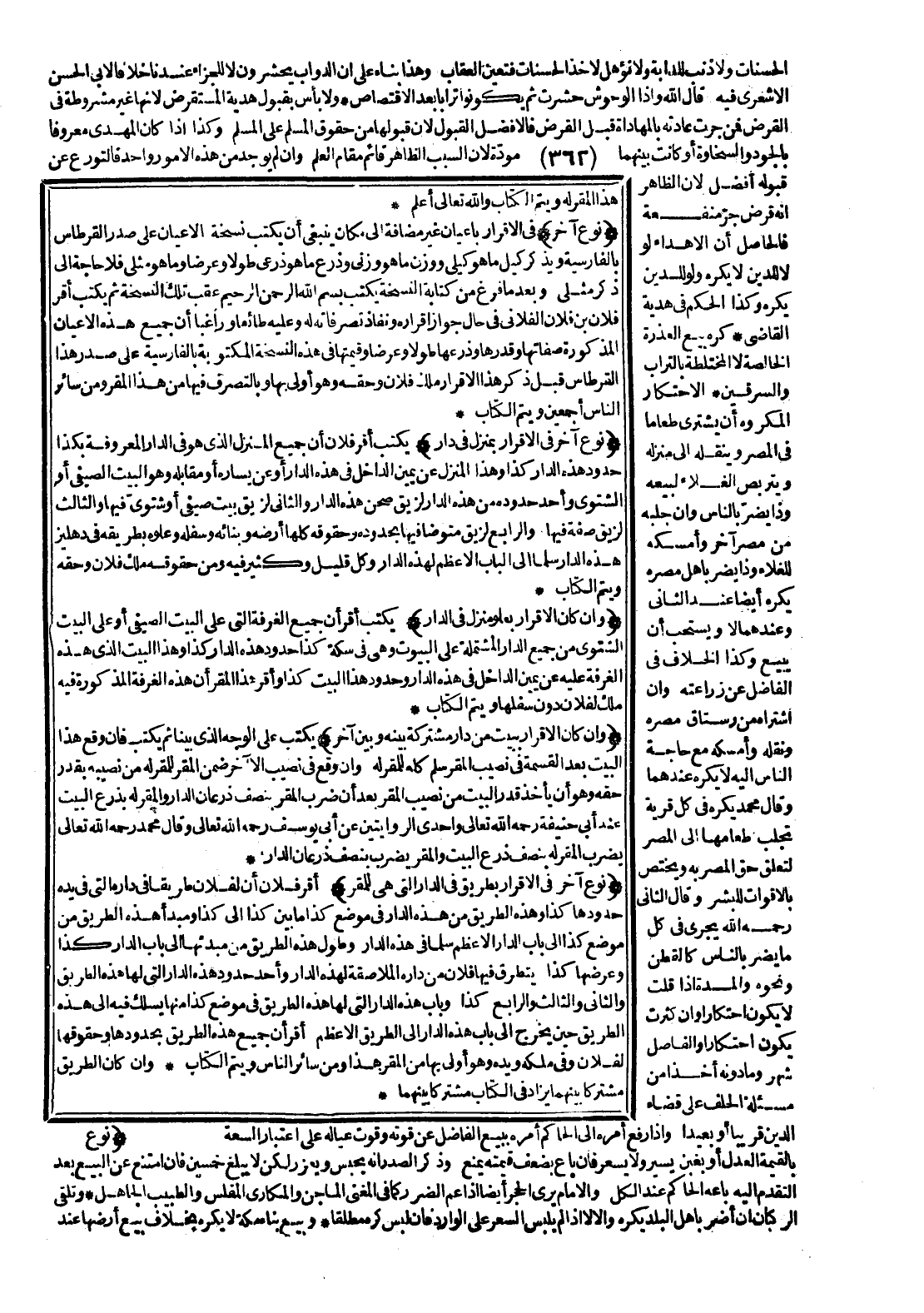 وَبَعْدَ مَا فَرَغَ مِنْ كِتَابَةِ النُّسْخَةِ يَكْتُبُ بِسْمِ اللَّهِ الرَّحْمَنِ الرَّحِيمِ عَقِبَ تِلْكَ النُّسْخَةِ ثُمَّ يَكْتُبُ أَقَرَّ فُلَانُ بْنُ فُلَانٍ الْفُلَانِيُّ فِي حَالِ جَوَازِ إقْرَارِهِ وَنَفَاذِ تَصَرُّفَاتِهِ لَهُ وَعَلَيْهِ طَائِعًا وَرَاغِبًا أَنَّ جَمِيعَ هَذِهِ الْأَعْيَانِ الْمَذْكُورَةِ صِفَاتُهَا وَقَدْرُهَا وَذَرْعُهَا طُولًا وَعَرْضًا وَقِيمَتُهَا فِي هَذِهِ النُّسْخَةِ الْمَكْتُوبَةِ بِالْفَارِسِيَّةِ عَلَى صَدْرِ هَذَا الْقِرْطَاسِ قَبْلَ ذِكْرِ هَذَا الْإِقْرَارِ مِلْكُ فُلَانٍ وَحَقُّهُ وَهُوَ أَوْلَى بِهَا وَبِالتَّصَرُّفِ فِيهَا مِنْ هَذَا الْمُقِرِّ وَمِنْ سَائِرِ النَّاسِ أَجْمَعِينَ، وَيُتِمُّ الْكِتَابَ.