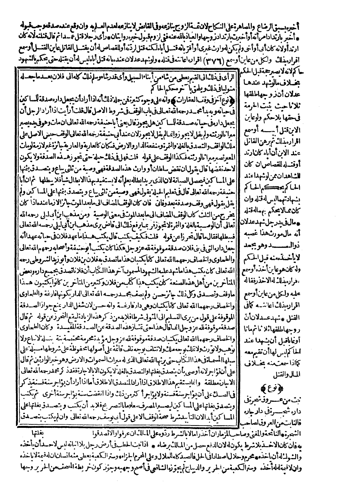 وَكَانَ الطَّحَاوِيُّ وَالْخَصَّافُ رَحِمَهُمَا اللَّهُ تَعَالَى يَكْتُبَانِ صَدَقَةً مَوْقُوفَةً لِلَّهِ عَزَّ وَجَلَّ مُؤَبَّدَةً مُحَرَّمَةً مُحْتَبَسَةً بَتَّةً بَتَلَةً لَا تُبَاعُ وَلَا تُوهَبُ وَلَا تُورَثُ وَلَا تُمْلَكُ بِوَجْهِ مِلْكٍ وَلَا تُتْلَفُ بِوَجْهِ تَلَفٍ قَائِمَةً عَلَى أُصُولِهَا مَحْفُوظَةً عَلَى شُرُوطِهَا مُسْبَلَةً عَلَى سُبُلِهَا الْمُسَمَّاةَ فِي هَذَا الْكِتَابِ حَتَّى يَرِثَهَا اللَّهُ تَعَالَى الَّذِي لَهُ مِيرَاثُ السَّمَوَاتِ وَالْأَرْضِ وَهُوَ خَيْرُ الْوَارِثِينَ.