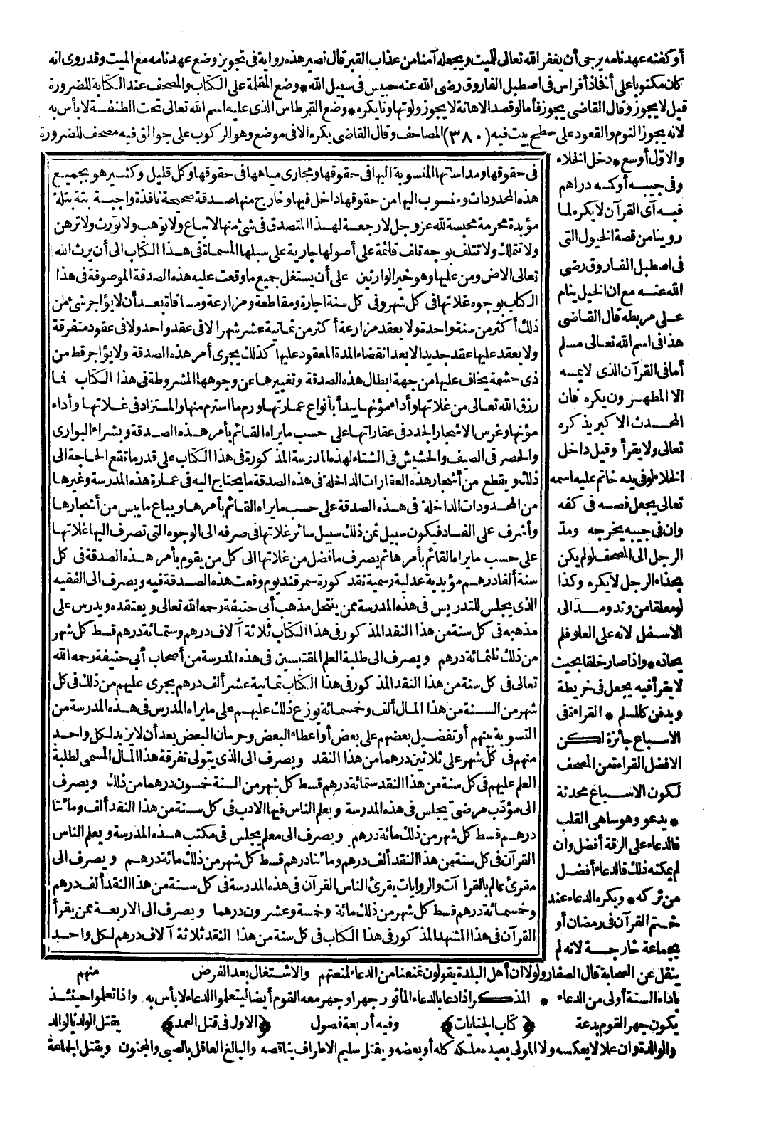 عَلَى أَنْ يُسْتَغَلَّ جَمِيعُ مَا وَقَعَتْ عَلَيْهِ هَذِهِ الصَّدَقَةُ الْمَوْصُوفَةُ فِي هَذَا الْكِتَابِ بِوُجُوهِ غَلَّاتِهَا فِي كُلِّ شَهْرٍ وَفِي كُلِّ سَنَةٍ إجَارَةً وَمُقَاطَعَةً وَمُزَارَعَةً وَمُسَاقَاةً بَعْدَ أَنْ لَا يُؤَاجَرَ شَيْءٌ مِنْ ذَلِكَ أَكْثَرَ مِنْ سَنَةٍ وَاحِدَةٍ وَلَا يُعْقَدُ مُزَارَعَةٌ أَكْثَرَ مِنْ ثَمَانِيَةَ عَشَرَ شَهْرًا لَا فِي عَقْدٍ وَاحِدٍ وَلَا فِي عُقُودٍ مُتَفَرِّقَةٍ وَلَا يُعْقَدُ عَلَيْهَا عَقْدٌ جَدِيدٌ إلَّا بَعْدَ انْقِضَاءِ الْمُدَّةِ الْمَعْقُودِ عَلَيْهَا كَذَلِكَ يَجْرِي أَمْرُ هَذِهِ الصَّدَقَةِ، وَلَا يُؤَاجَرُ قَطُّ مِنْ ذِي حِشْمَةٍ يُخَافُ عَلَيْهَا مِنْ جِهَةِ إبْطَالِ هَذِهِ الصَّدَقَةِ وَتَغْيِيرِهَا عَنْ وُجُوهِهَا الْمَشْرُوطَةِ فِي هَذَا الْكِتَابِ فَمَا رَزَقَ اللَّهُ تَعَالَى مِنْ غَلَّاتِهَا وَأَدَاءِ مُؤَنِهَا يُبْدَأُ بِأَنْوَاعِ عِمَارَتِهَا وَرَمِّ مَا اسْتَرَمَّ مِنْهَا وَالْمُسْتَزَادُ فِي غَلَّاتِهَا وَأَدَاءِ مُؤَنِهَا وَغَرْسِ الْأَشْجَارِ الْجُدُدِ فِي عَقَارَاتِهَا عَلَى حَسَبِ مَا يَرَاهُ الْقَائِمُ بِأَمْرِ هَذِهِ الصَّدَقَةِ وَبِشِرَاءِ الْبَوَارِي وَالْحُصُرِ فِي الصَّيْفِ وَالْحَشِيشِ فِي الشِّتَاءِ لِهَذِهِ الْمَدْرَسَةِ الْمَذْكُورَةِ فِي هَذَا الْكِتَابِ عَلَى قَدْرِ مَا تَقَعُ الْحَاجَةُ إلَى ذَلِكَ، وَيُقْطَعُ مِنْ أَشْجَارِ هَذِهِ الْعَقَارَاتِ الدَّاخِلَةِ فِي هَذِهِ الصَّدَقَةِ مَا يَحْتَاجُ إلَيْهِ فِي عِمَارَةِ هَذِهِ الْمَدْرَسَةِ وَغَيْرِهَا مِنْ الْمَحْدُودَاتِ الدَّاخِلَةِ فِي هَذِهِ الصَّدَقَةِ عَلَى حَسَبِ مَا يَرَاهُ الْقَائِمُ بِأَمْرِهَا وَيُبَاعُ مَا يَبِسَ مِنْ أَشْجَارِهَا وَأَشْرَفَ عَلَى الْفَسَادِ فَيَكُونُ سَبِيلُ ثَمَنِ ذَلِكَ سَبِيلَ سَائِرِ غَلَّاتِهَا إلَى كُلِّ مَنْ يَقُومُ بِأَمْرِ هَذِهِ الصَّدَقَةِ فِي كُلِّ سَنَةٍ أَلْفَا دِرْهَمٍ مُؤَيَّدِيَّةً عَدْلِيَّةً رَسْمِيَّةً نَقْدَ كُورَةِ سَمَرْقَنْدَ يَوْمَ وَقَعَتْ هَذِهِ الصَّدَقَةُ فِيهِ وَيُصْرَفُ إلَى الْفَقِيهِ الَّذِي يَجْلِسُ لِلتَّدْرِيسِ فِي هَذِهِ الْمَدْرَسَةِ مِمَّنْ يَنْتَحِلُ مَذْهَبَ أَبِي حَنِيفَةَ - رَحِمَهُ اللَّهُ تَعَالَى - وَيَعْتَقِدَهُ وَيُدَرِّسُ عَلَى مَذْهَبِهِ فِي كُلِّ سَنَةٍ مِنْ هَذَا النَّقْدِ الْمَذْكُورِ فِي هَذَا الْكِتَابِ ثَلَاثَةُ آلَافِ دِرْهَمٍ وَسِتُّمِائَةِ دِرْهَمٍ قِسْطُ كُلِّ شَهْرٍ مِنْ ذَلِكَ ثَلَثُمِائَةِ دِرْهَمٍ.