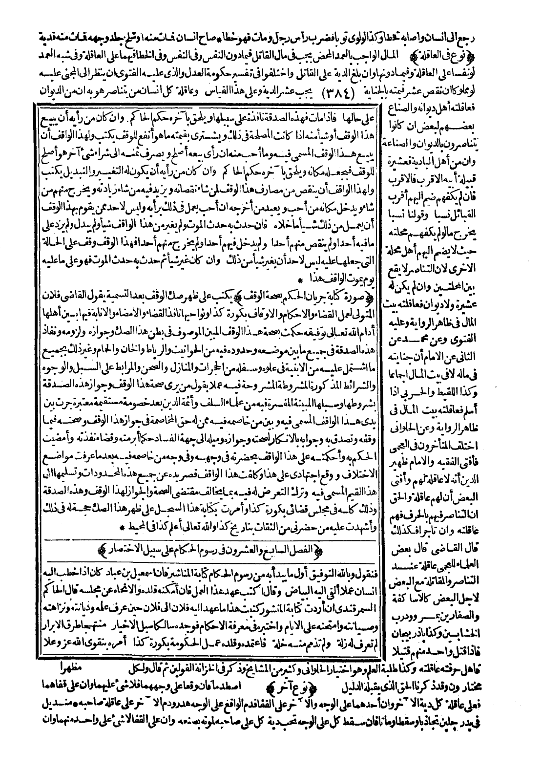 (الْفَصْلُ السَّابِعُ وَالْعِشْرُونَ فِي رُسُومِ الْحُكَّامِ عَلَى سَبِيلِ الِاخْتِصَارِ) فَنَقُولُ وَبِاَللَّهِ التَّوْفِيقُ أَوَّلُ مَا يُبْدَأُ بِهِ مِنْ رُسُومِ الْحُكَّامِ كِتَابَةُ الْمَنَاشِيرِ فَإِنَّ إسْمَاعِيلَ بْنَ عَبَّادٍ كَانَ إذَا خَطَبَ إلَيْهِ إنْسَانٌ عَمَلًا أَلْقَى إلَيْهِ الْبَيَاضَ وَقَالَ اُكْتُبْ عَهْدَ هَذَا الْعَمَلِ، فَإِنْ أَمْكَنَهُ قَلَّدَهُ وَإِلَّا نَحَّاهُ عَنْ مَجْلِسِهِ قَالَ الْحَاكِمُ السَّمَرْقَنْدِيُّ إنْ أَرَدْت كِتَابَةَ الْمَنْشُورِ كَتَبْت هَذَا مَا عَهِدَ إلَيْهِ فُلَانٌ إلَى فُلَانٍ حِينَ عَرَفَ عِلْمَهُ وَدِيَانَتَهُ وَنَزَاهَتَهُ وَصِيَانَتَهُ وَامْتَحَنَهُ عَلَى الْأَيَّامِ وَاخْتَبَرَهُ فِي مَعْرِفَةِ الْأَحْكَامِ فَوَجَدَهُ سَالِكًا سُبُلَ الْأَخْيَارِ مُنْتَهِجًا طُرُقَ الْأَبْرَارِ لَمْ تُعْرَفْ لَهُ زَلَّةٌ وَلَمْ تُذْمَمْ مِنْهُ خُلَّةٌ فَاعْتَمَدَهُ وَقَلَّدَهُ عَمَلَ الْحُكُومَةِ بِكُورَةِ كَذَا أَمَرَهُ بِتَقْوَى اللَّهِ عَزَّ وَعَلَا