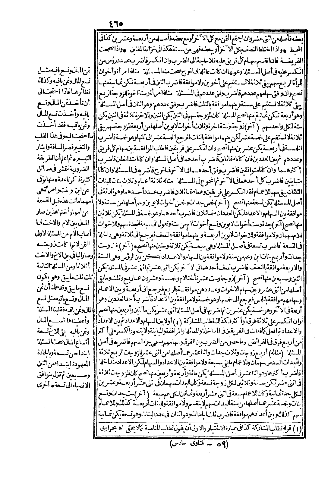 (آخَرُ) سِتُّ جَدَّاتٍ وَتِسْعُ بَنَاتٍ وَخَمْسَةَ عَشَرَ عَمًّا أَصْلُهَا مِنْ سِتَّةٍ لِلْجَدَّاتِ سَهْمٌ لَا يَنْقَسِمُ وَلَا مُوَافَقَةَ وَلِلْبَنَاتِ أَرْبَعَةٌ كَذَلِكَ، وَلِلْأَعْمَامِ سَهْمٌ كَذَلِكَ، وَبَيْنَ أَعْدَادِهِمْ مُوَافَقَةُ ثُلُثِ الْجَدَّاتِ وَهُوَ اثْنَانِ فِي عَدَدِ الْبَنَاتِ وَهُوَ تِسْعَةٌ يَكُنْ ثَمَانِيَةَ