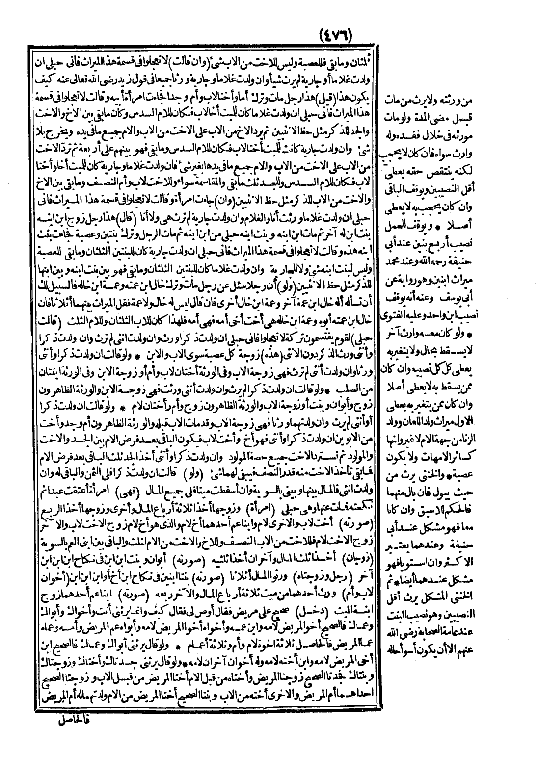 (قَالَتْ حُبْلَى) لِقَوْمٍ يَقْتَسِمُونَ تَرِكَةً لَا تَعْجَلُوا فَإِنِّي حُبْلَى إنْ وَلَدْتُ ذَكَرًا وَرِثَ، وَإِنْ وَلَدْتُ أُنْثَى لَمْ تَرِثْ وَإِنْ وَلَدْتُ ذَكَرًا وَأُنْثَى وَرِثَ الذَّكَرُ دُونَ الْأُنْثَى (هَذِهِ) زَوْجَةُ كُلِّ عَصَبَةٍ سِوَى الْأَبِ وَالِابْنِ.