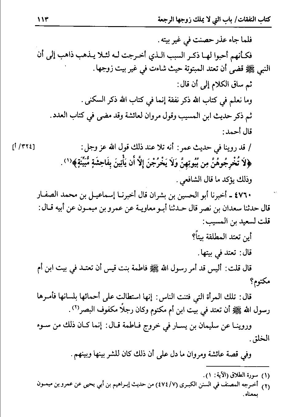 قال أحمد : قد روينا في حديث عمر : أنه تلا عند ذلك قول الله عز وجل {لاَتُخْرِجُوهُنَّ مِن بُيُوتِهنَّ وَلاَ يُخْرُجْنَ إِلاَّ أَن يَأْتِينَ بِفَاحِشَةٍ مُّبَيِّنَةٍ}.
