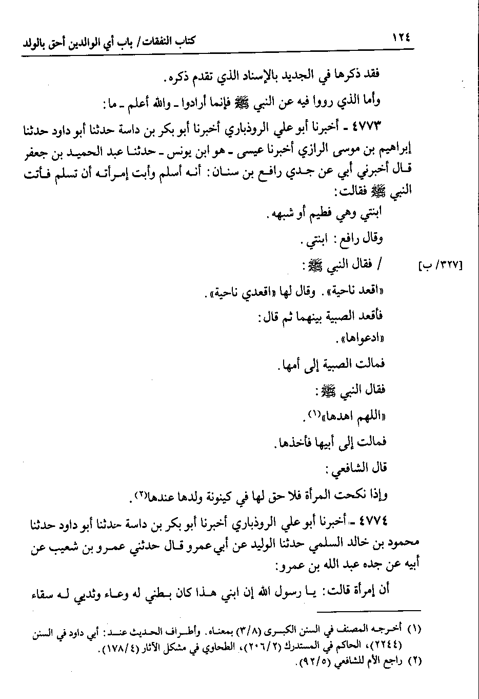 4774 - أخبرنا أبو علي الروذباري أخبرنا أبو بكر بن داسة حدثنا أبو داود حدثنا محمود بن خالد السلمي حدثنا الوليد عن أبي عمرو قال حدثني عمرو بن شعيب عن أبيه عن جده عبد الله بن عمرو : أن إمرأة قالت : يا رسول الله إن ابني هذا كان بطني له وعاء وثديي له سقاء