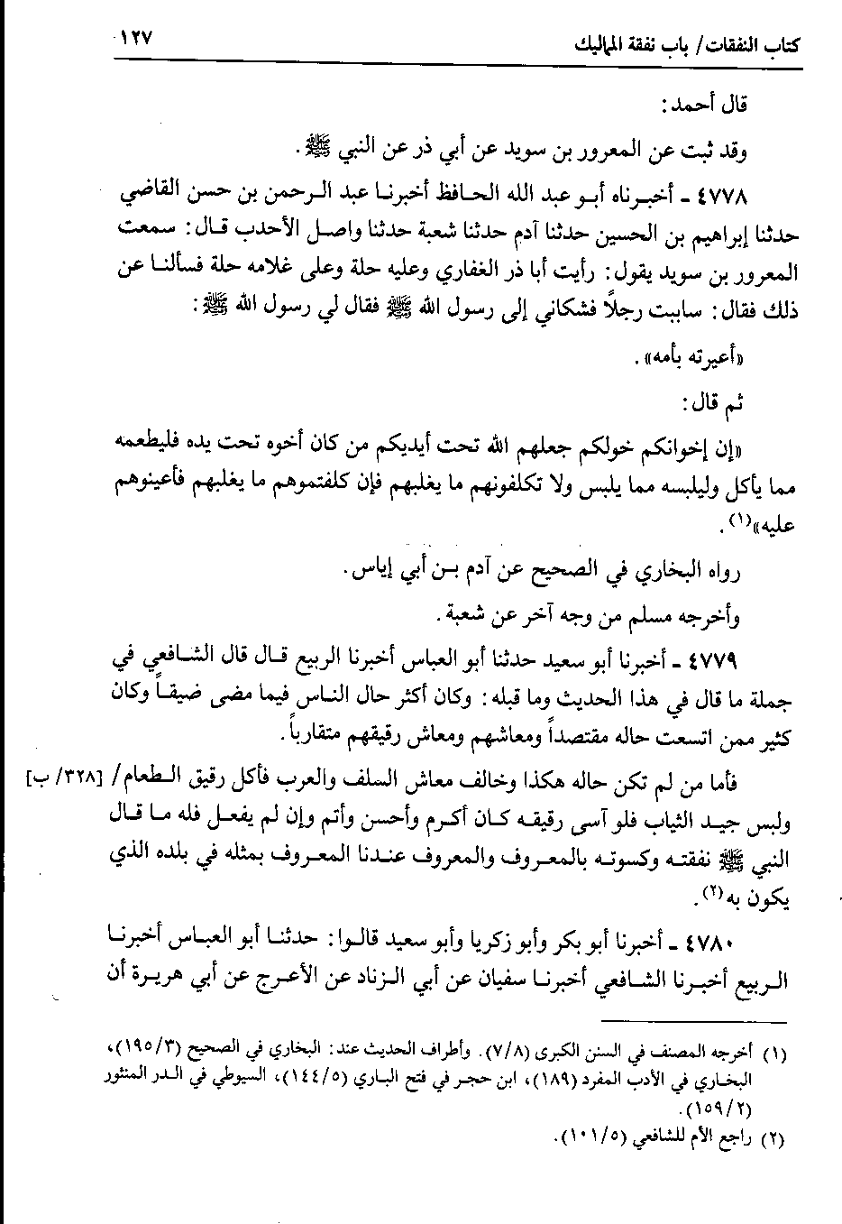 4778 - أخبرناه أبو عبد الله الحافظ أخبرنا عبد الرحمن بن حسن القاضي حدثنا إبراهيم بن الحسين حدثنا آدم حدثنا شعبة حدثنا واصل الأحدب قال : سمعت المعرور بن سويد يقول : رأيت أبا ذر الغفاري وعليه حلة وعلى غلامه حلة فسألنا عن ذلك فقال : ساببت رجلاً فشكاني إلى رسول الله صلى الله عليه وسلم فقال لي رسول الله صلى الله عليه وسلم : أعيرته بأمه.