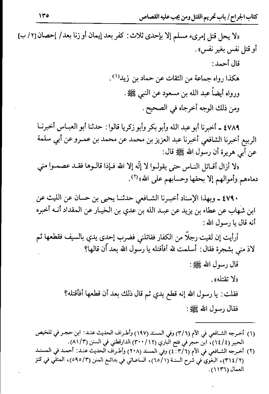 لا يحل قتل إمرئ مسلم إلا بإحدى ثلاث : كفر بعد إيمان أو زنا بعد إحصان أو قتل نفس بغير نفس.