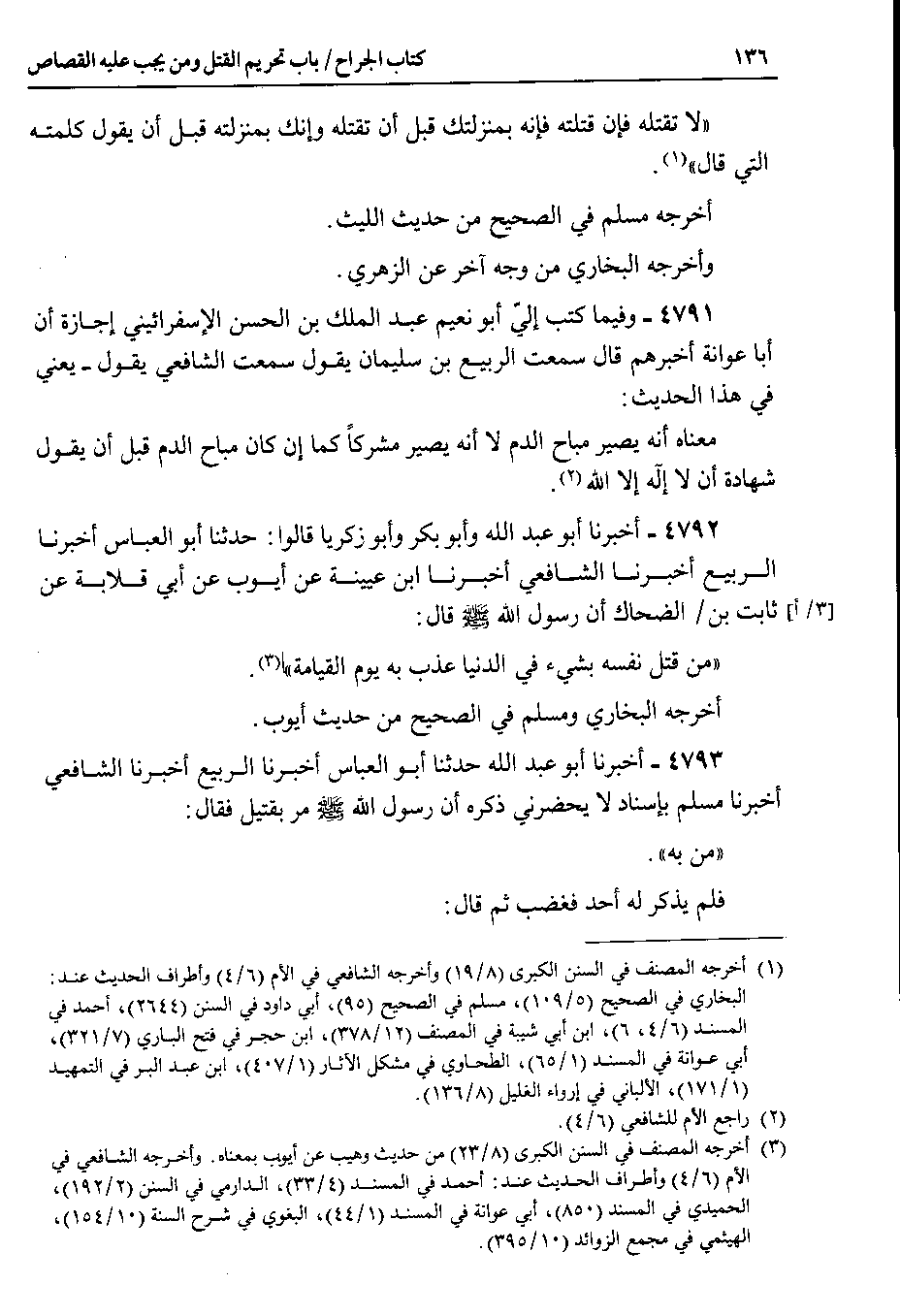 4791 - وفيما كتب إليّ أبو نعيم عبد الملك بن الحسن الإسفرائيني إجازة أن أبا عوانة أخبرهم قال سمعت الربيع بن سليمان يقول سمعت الشافعي يقول - يعني في هذا الحديث : معناه أنه يصير مباح الدم لا أنه يصير مشركاً كما إن كان مباح الدم قبل أن يقول شهادة أن لا إله إلا الله ).