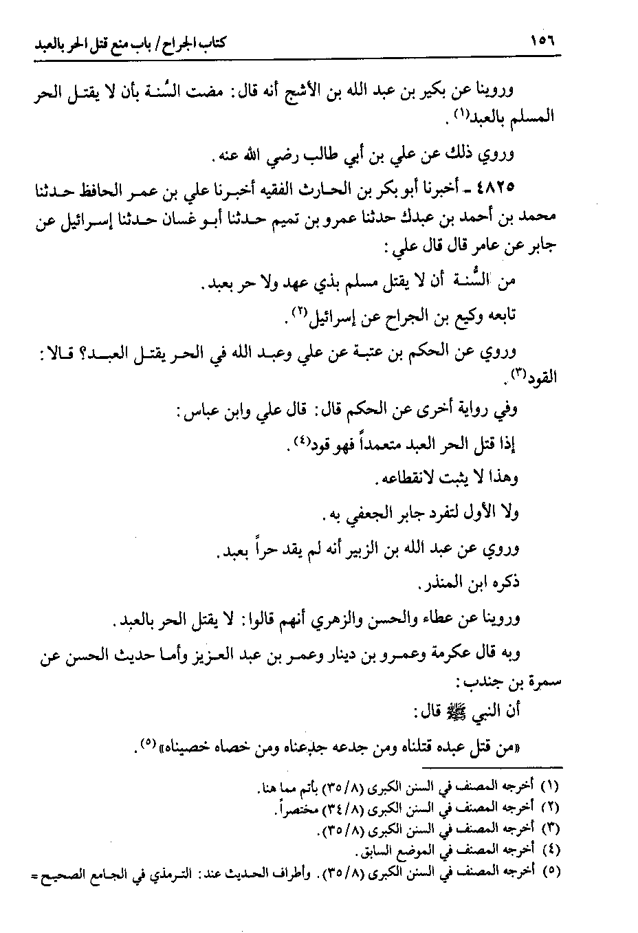 وروينا عن بكير بن عبد الله بن الأشج أنه قال : مضت السُنة بأن لا يقتل الحر المسلم بالعبد.