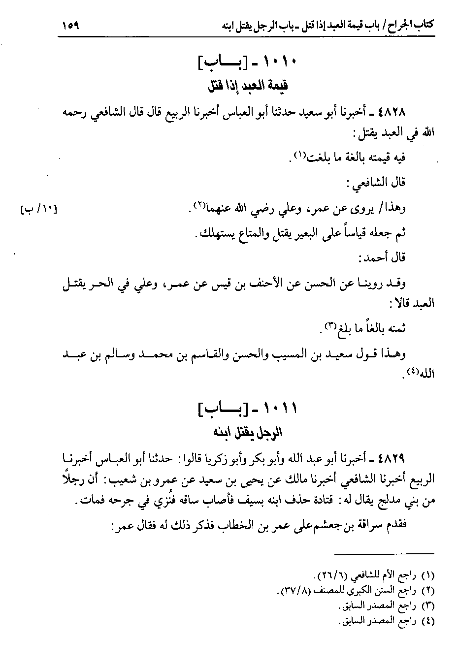 4829 - أخبرنا أبو عبد الله وأبو بكر وأبو زكريا قالوا : حدثنا أبو العباس أخبرنا الربيع أخبرنا الشافعي أخبرنا مالك عن يحيى بن سعيد عن عمرو بن شعيب : أن رجلاً من بني مدلج يقال له : قتادة حذف ابنه بسيف فأصاب ساقه فُنزي في جرحه فمات.