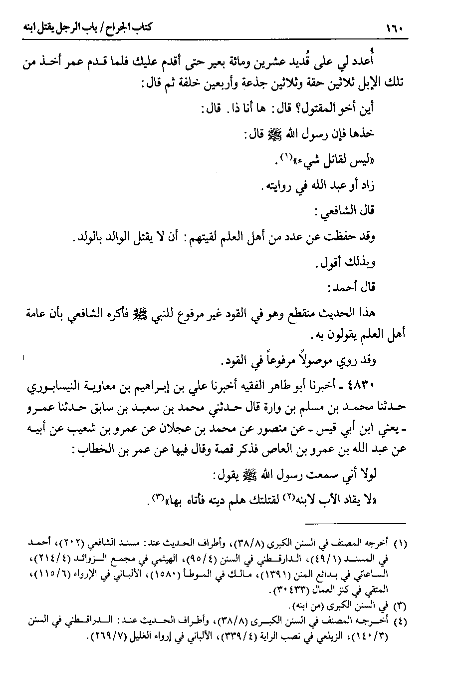 4830 - أخبرنا أبو طاهر الفقيه أخبرنا علي بن إبراهيم بن معاوية النيسابوري حدثنا محمد بن مسلم بن وارة قال حدثني محمد بن سعيد بن سابق حدثنا عمرو - يعني ابن أبي قيس - عن منصور عن محمد بن عجلان عن عمرو بن شعيب عن أبيه عن عبد الله بن عمرو بن العاص فذكر قصة وقال فيها عن عمر بن الخطاب : لولا أني سمعت رسول الله صلى الله عليه وسلم يقول : لا يقاد الأب لابنه لقتلتك هلم ديته فأتاه بها.