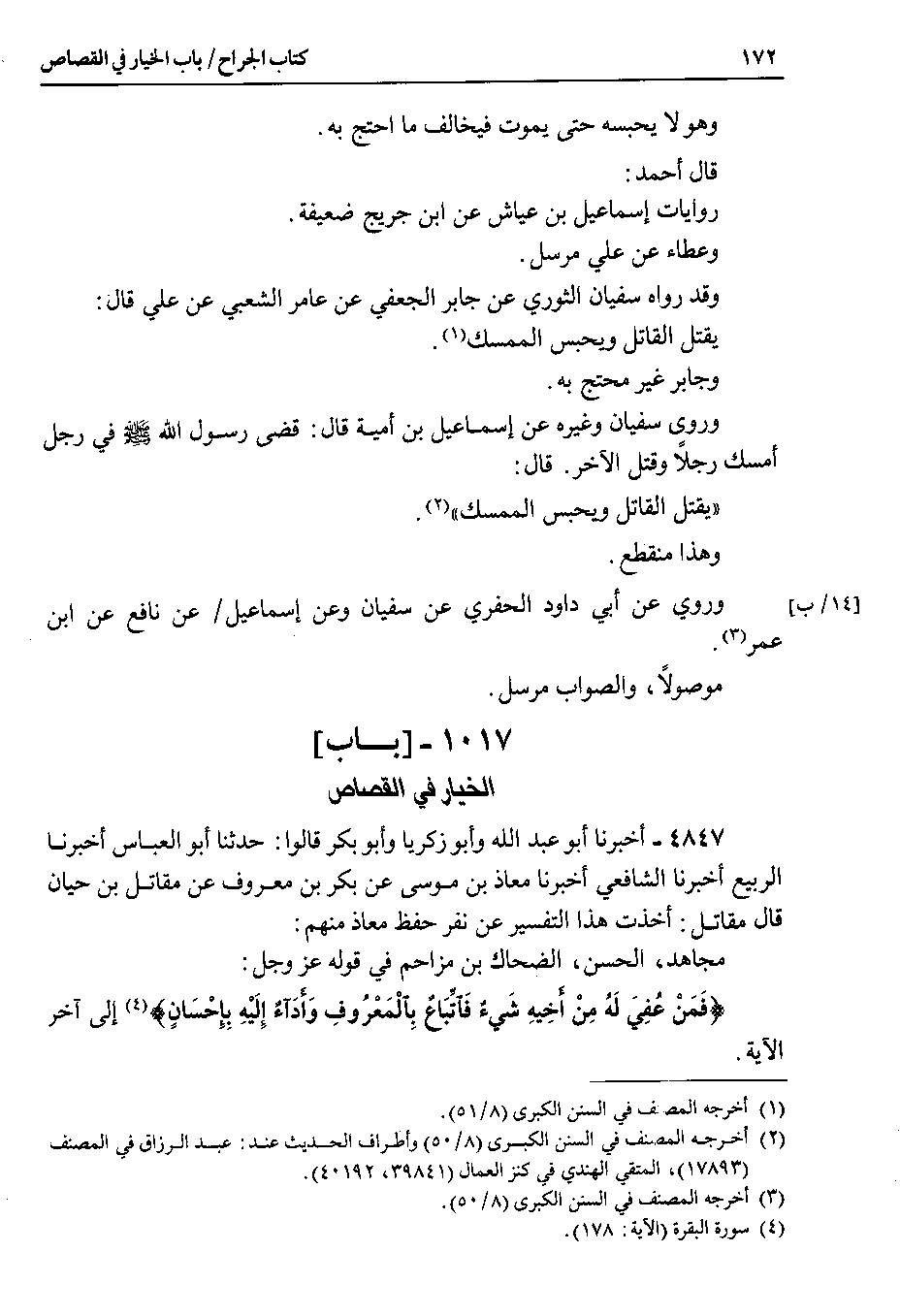 4847 - أخبرنا أبو عبد الله وأبو زكريا وأبو بكر قالوا Y حدثنا أبو العباس أخبرنا الربيع أخبرنا الشافعي أخبرنا معاذ بن موسى عن بكر بن معروف عن مقاتل بن حيان قال مقاتل Y أخذت هذا التفسير عن نفر حفظ معاذ منهم Y مجاهد ، الحسن ، الضحاك بن مزاحم في قوله D {فَمَنْ عُفِيَ لَهُ مِنْ أَخِيهِ شَيءٌ فَاتِّبَاعُ بِالْمَعْرُوفِ وَأَدَآءُ إِلَيْهِ بِإِحْسَانٍ} إلى آخر الآية.