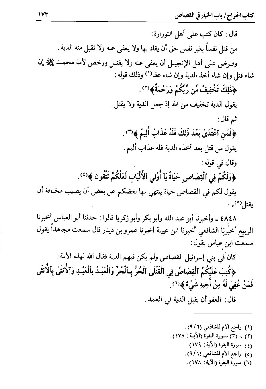 4848 - وأخبرنا أبو عبد الله وأبو بكر وأبو زكريا قالوا Y حدثنا أبو العباس أخبرنا الربيع أخبرنا الشافعي أخبرنا ابن عيينة أخبرنا عمرو بن دينار قال سمعت مجاهداً يقول سمعت ابن عباس يقول Y كان في بني إسرائيل القصاص ولم يكن فيهم الدية فقال الله لهذه الأمة {كُتِبَ عَلَيْكُمُ الْقِصَاصُ فِي الْقَتْلَى الْحُرُّ بِالْحُرِّ والْعَبْدُ باِلْعَبْدِ وَالأُنَثى بالأنثَى فَمَنْ عُفِيَ لَهُ مِنْ أَخِيهِ شَيْءٌ}.