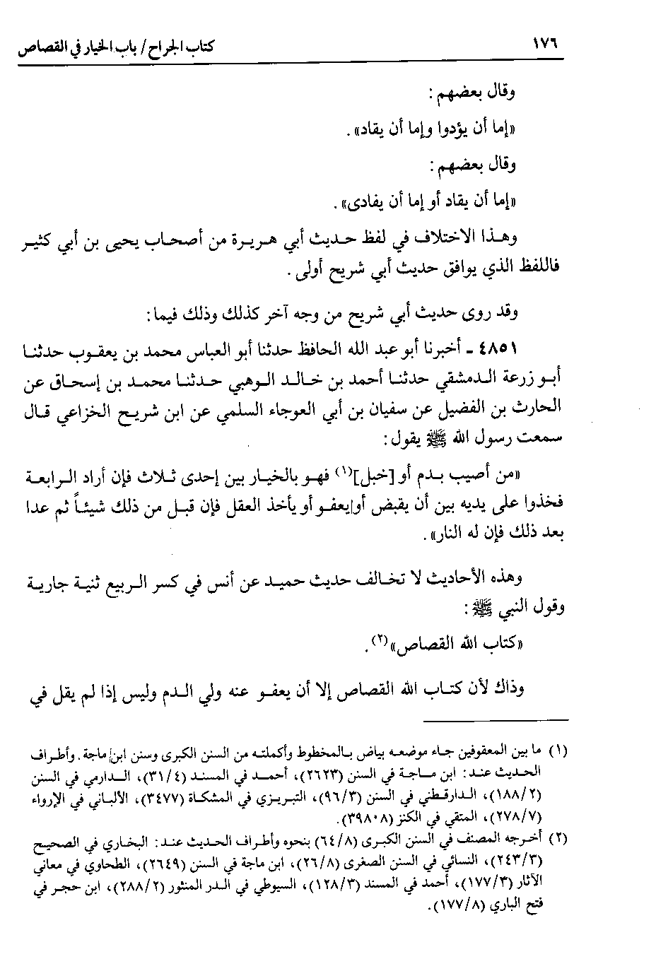 وقد روى حديث أبي شريح من وجه آخر كذلك وذلك فيما 4851 - أخبرنا أبو عبد الله الحافظ حدثنا أبو العباس محمد بن يعقوب حدثنا أبو زرعة الدمشقي حدثنا أحمد بن خالد الوهبي حدثنا محمد بن إسحاق عن الحارث بن الفضيل عن سفيان بن أبي العوجاء السلمي عن ابن شريح الخزاعي قال سمعت رسول الله A يقول Y من أصيب بدم أو خبل فهو بالخيار بين إحدى ثلاث فإن أراد الرابعة فخذوا على يديه بين أن يقبض أو يعفوا أو يأخذ العقل فإن قبل من ذلك شيئاً ثم عدا بعد ذلك فإن له النار.