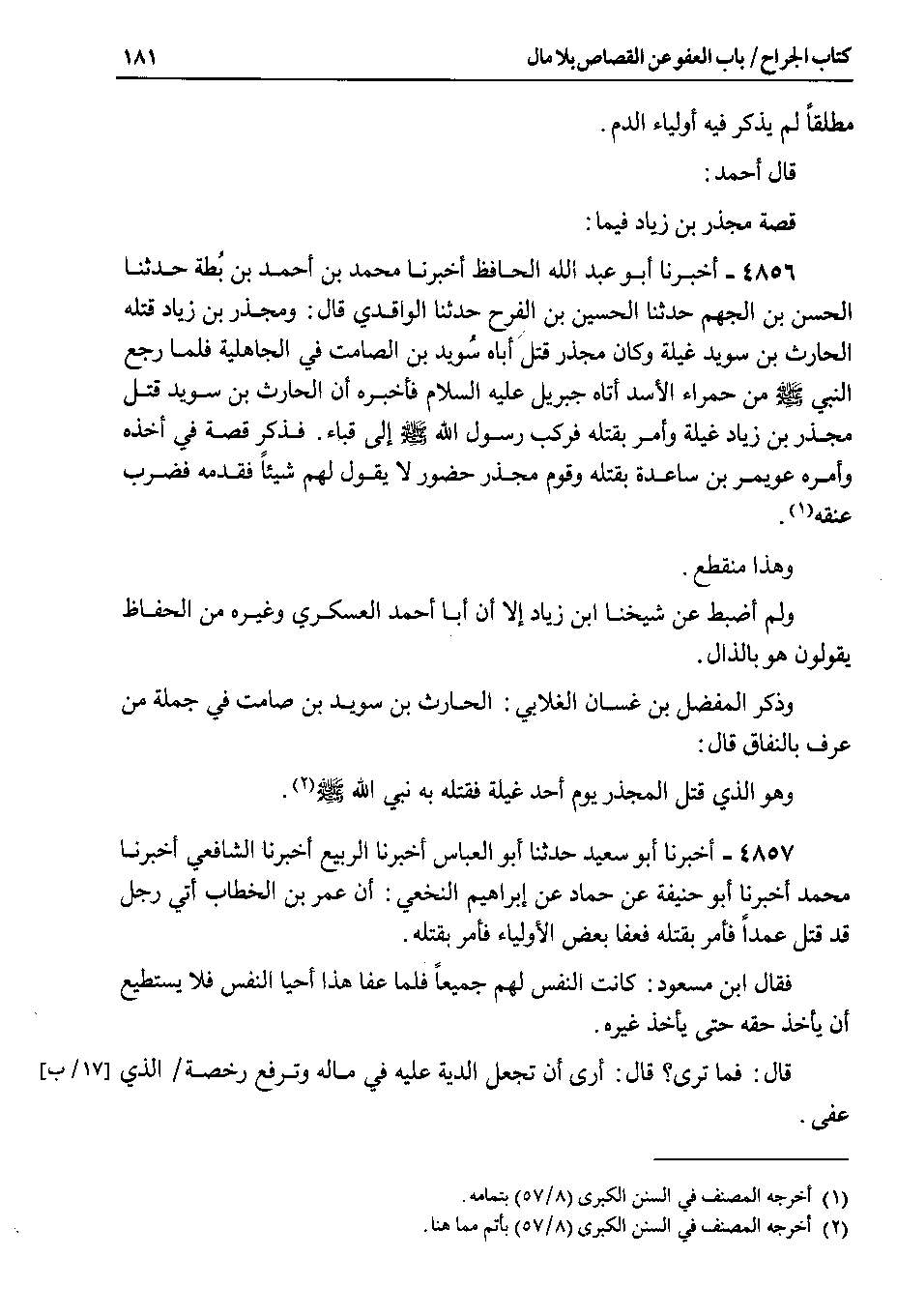 4857 - أخبرنا أبو سعيد حدثنا أبو العباس أخبرنا الربيع أخبرنا الشافعي أخبرنا محمد أخبرنا أبو حنيفة عن حماد عن إبراهيم النخعي : أن عمر بن الخطاب أتي رجل قد قتل عمداً فأمر بقتله فعفا بعض الأولياء فأمر بقتله.