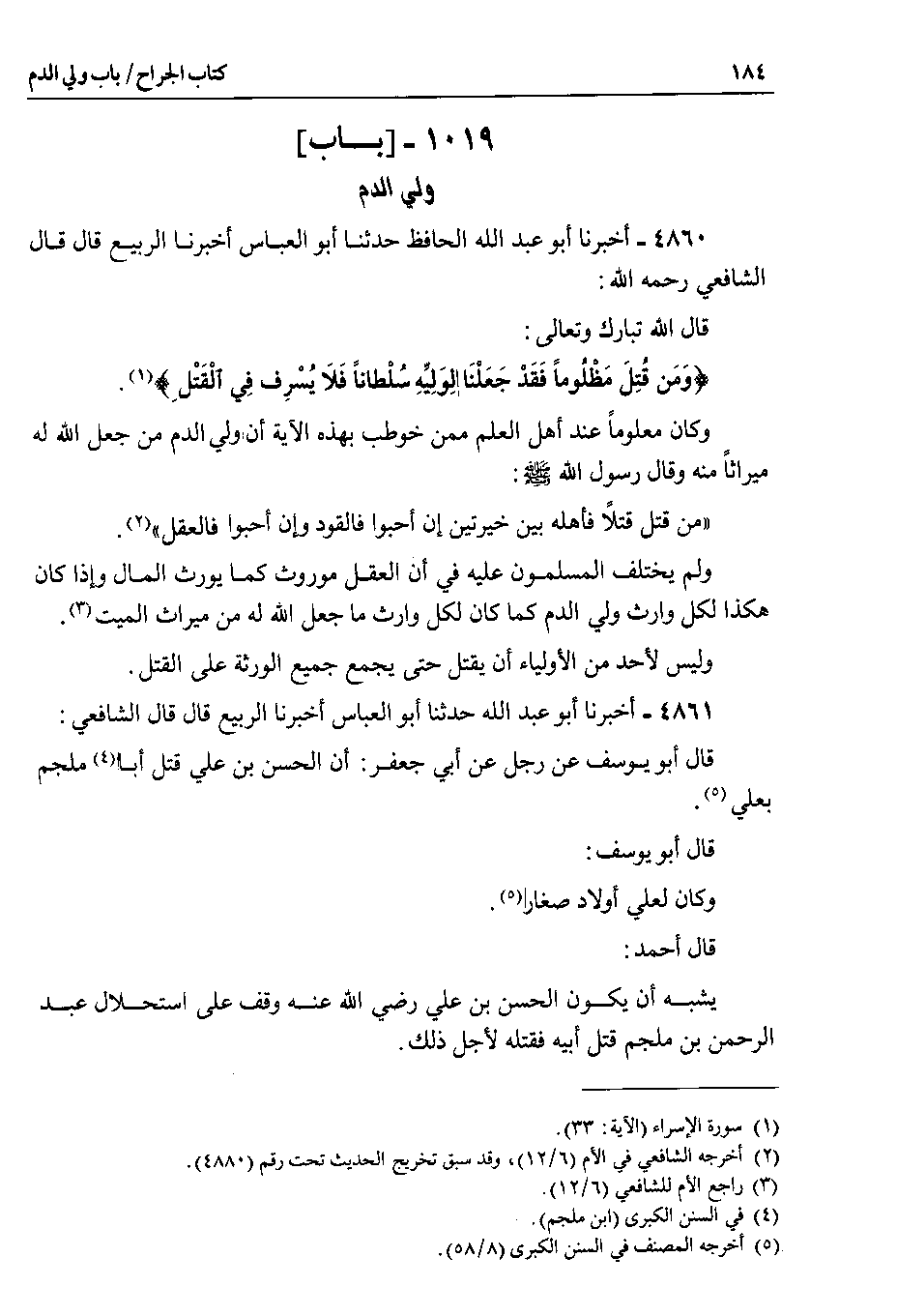 4860 - أخبرنا أبو عبد الله الحافظ حدثنا أبو العباس أخبرنا الربيع قال قال الشافعي رحمه الله : قال الله تبارك وتعالى {وَمَن قُتِلَ مَظْلُوماً فَقَدْ جَعَلْنَا الِوَلِيِّهِ سُلْطاناً فَلاَ يُسْرِف فِي الْقَتْلِ}.