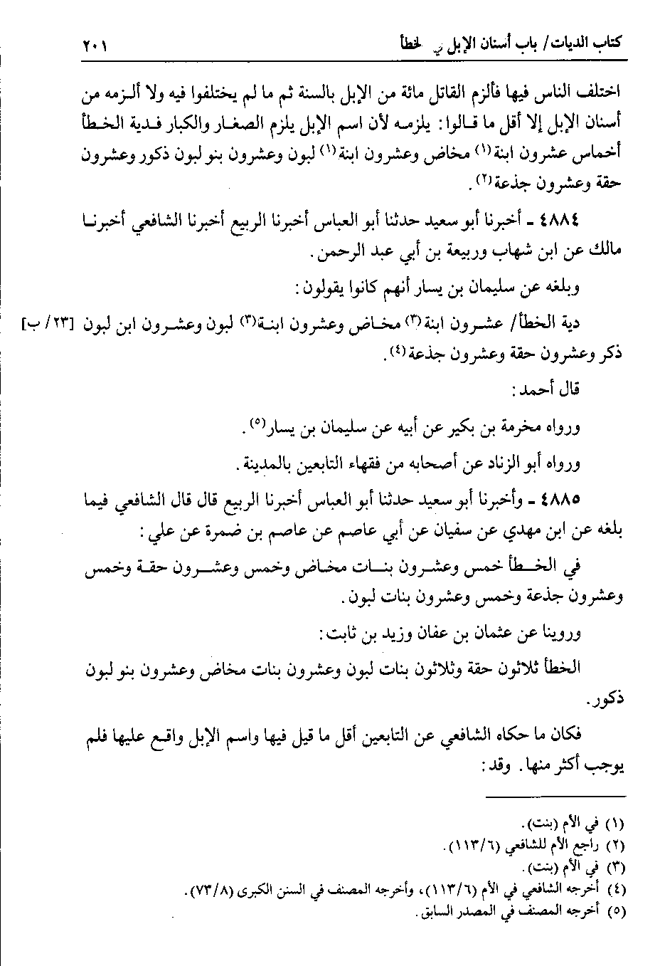4885 - وأخبرنا أبو سعيد حدثنا أبو العباس أخبرنا الربيع قال قال الشافعي فيما بلغه عن ابن مهدي عن سفيان عن أبي عاصم عن عاصم بن ضمرة عن علي : في الخطأ خمس وعشرون بنات مخاض وخمس وعشرون حقة وخمس وعشرون جذعة وخمس وعشرون بنات لبون.
