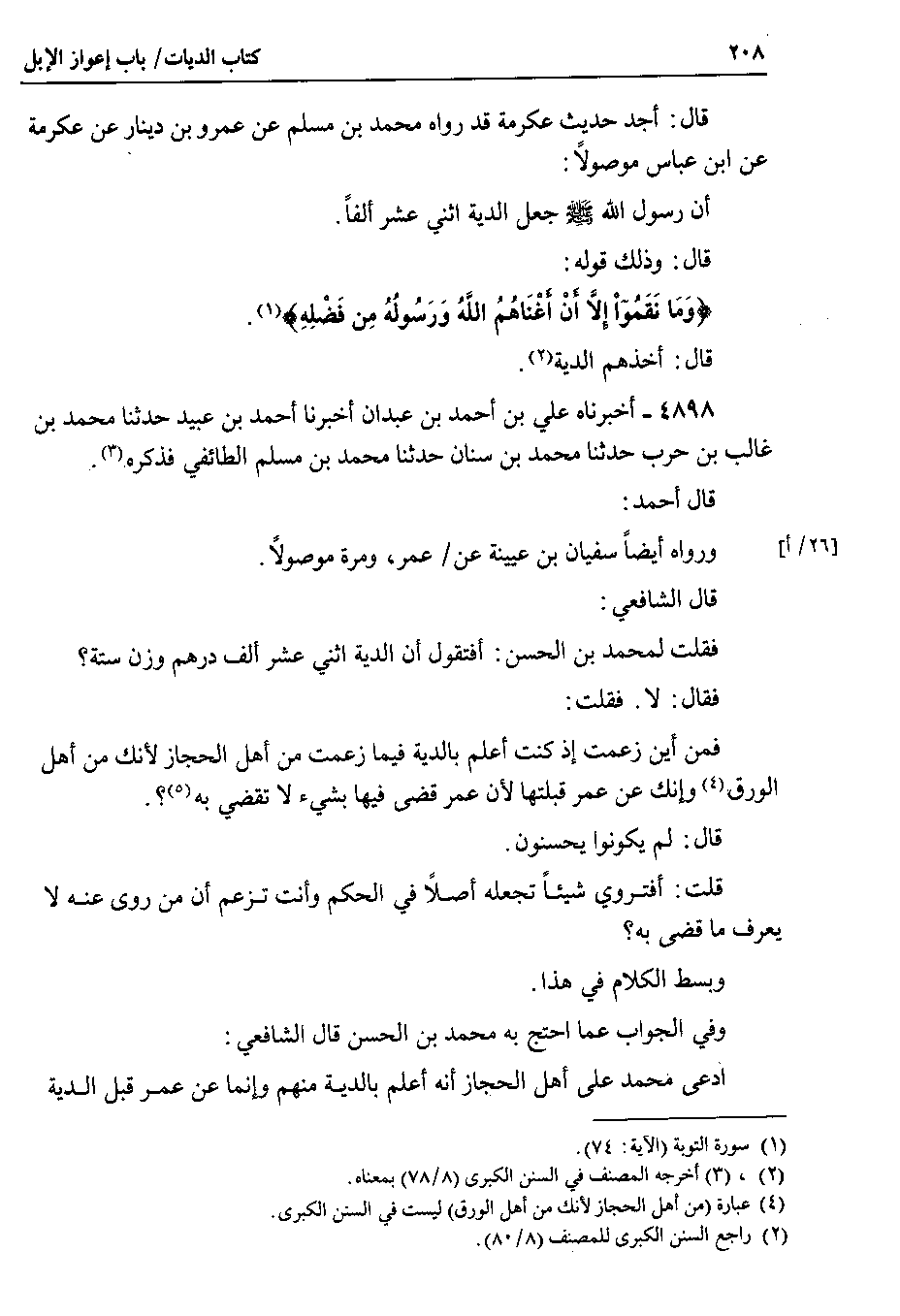قال الشافعي : فقلت لمحمد بن الحسن : أفتقول أن الدية اثني عشر ألف درهم وزن ستة ؟ فقال : لا . فقلت : فمن أين زعمت إذ كنت أعلم بالدية فيما زعمت من أهل الحجاز لأنك من أهل الورق وإنك عن عمر قبلتها لأن عمر قضى فيها بشيء لا تقضي به ؟.