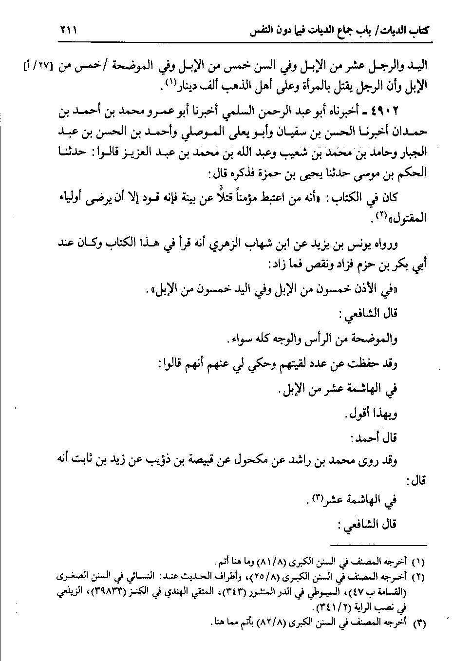 1 @اليد والرجل عشر من الإبل وفي السن خمس من الإبل وفي الموضحة خمس من الإبل وأن الرجل يقتل بالمرأة وعلى أهل الذهب ألف دينار.