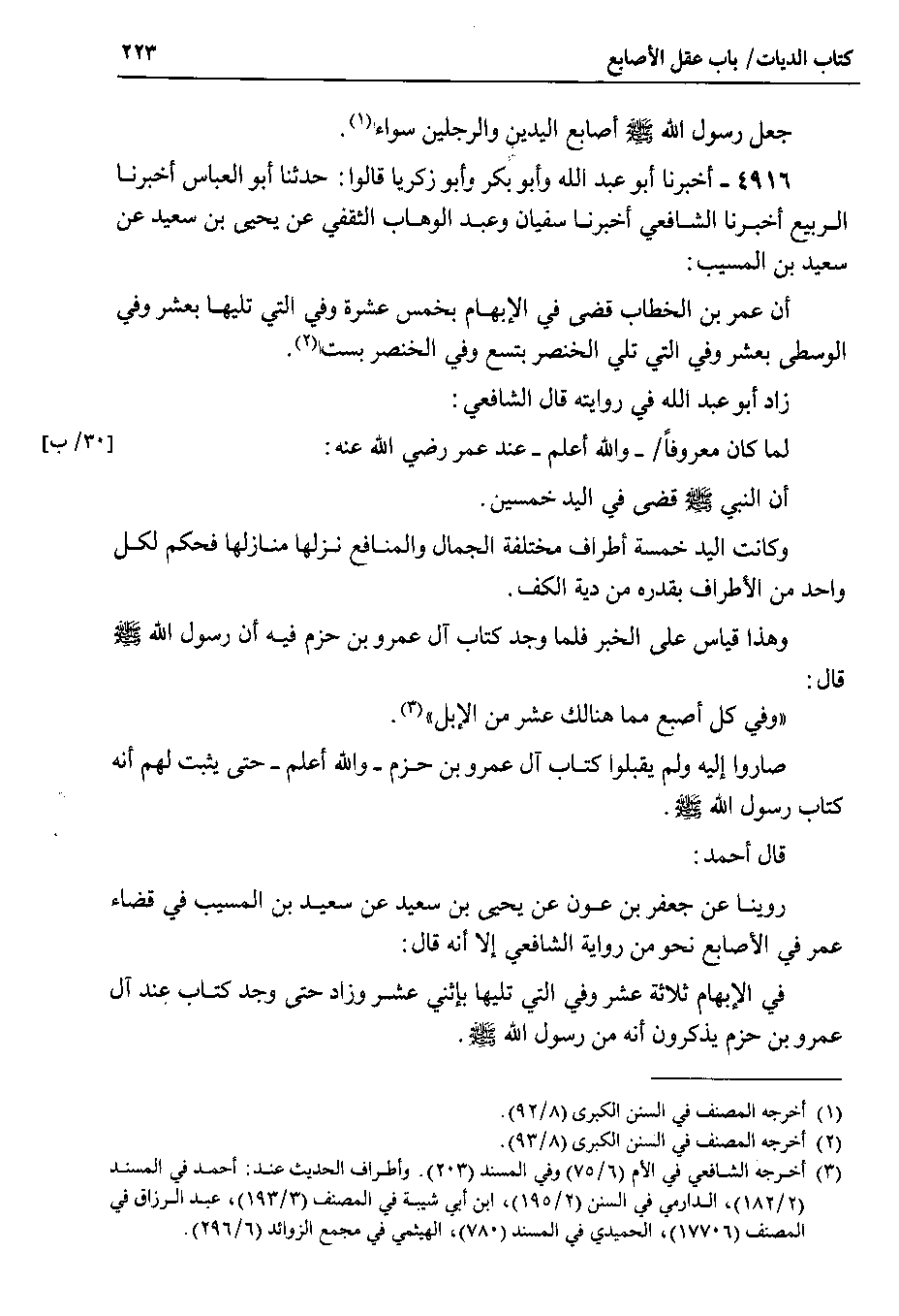 قال أحمد : روينا عن جعفر بن عون عن يحيى بن سعيد عن سعيد بن المسيب في قضاء عمر في الأصابع نحو من رواية الشافعي إلا أنه قال : في الإبهام ثلاثة عشر وفي التي تليها بإثني عشر وزاد حتى وجد كتاب عند آل عمرو بن حزم يذكرون أنه من رسول الله صلى الله عليه وسلم.