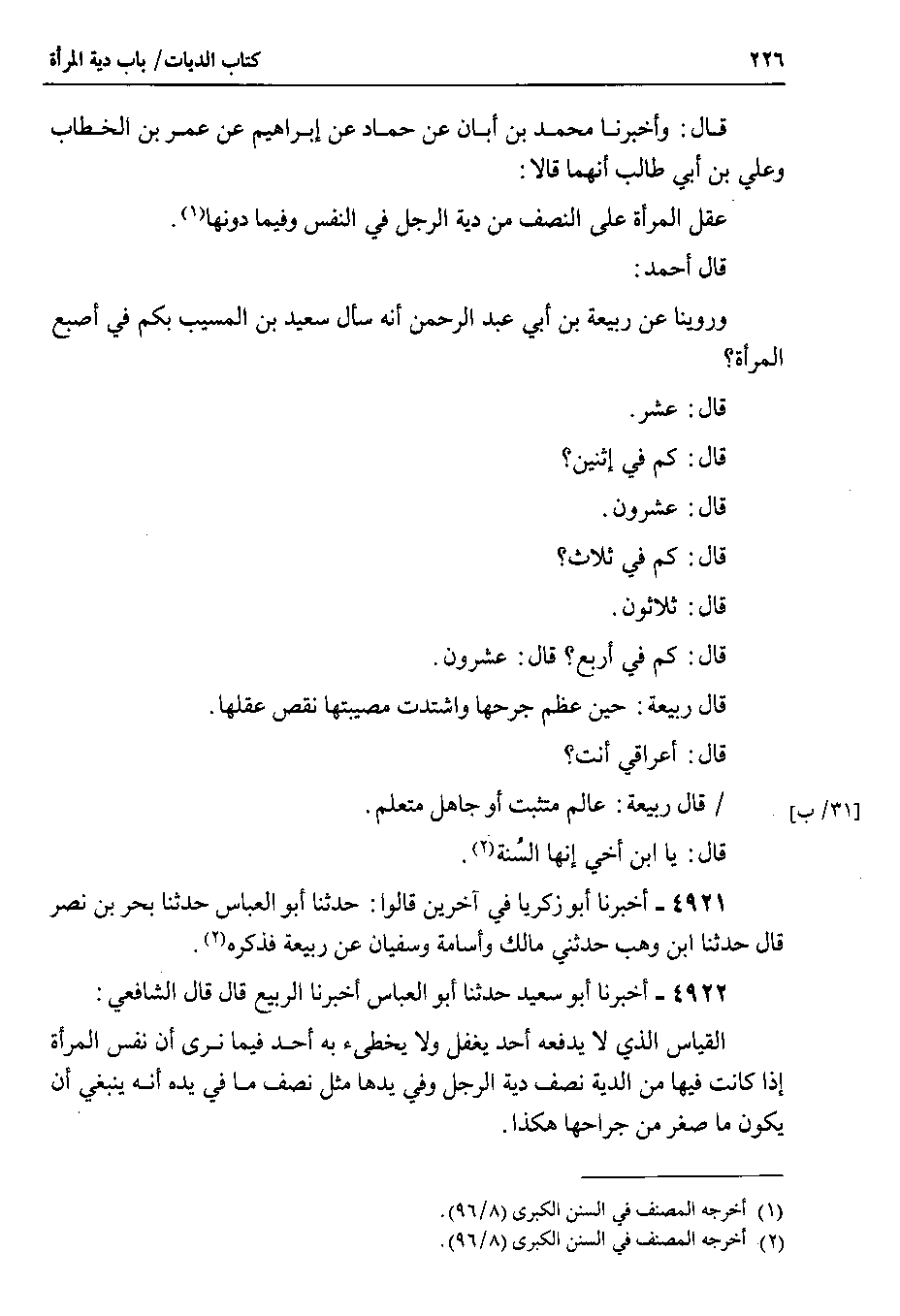 4922 - أخبرنا أبو سعيد حدثنا أبو العباس أخبرنا الربيع قال قال الشافعي : القياس الذي لا يدفعه أحد يغفل ولا يخطىء به أحد فيما نرى أن نفس المرأة إذا كانت فيها من الدية نصف دية الرجل وفي يدها مثل نصف ما في يده أنه ينبغي أن يكون ما صغر من جراحها هكذا.