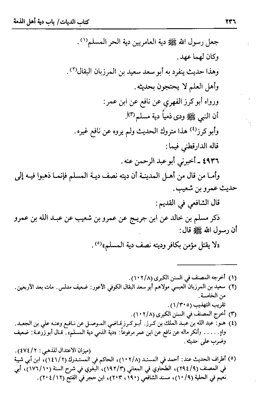 قال الشافعي في القديم : ذكر مسلم بن خالد عن ابن جريج عن عمرو بن شعيب عن عبد الله بن عمرو أن رسول الله صلى الله عليه وسلم قال : لا يقتل مؤمن بكافر وديته نصف دية المسلم.