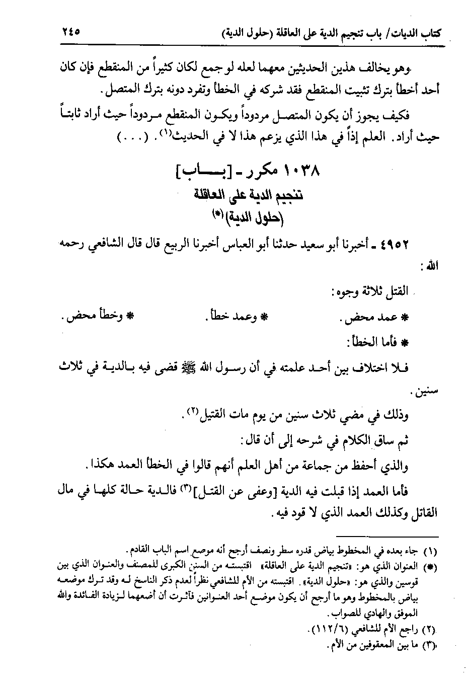 فكيف يجوز أن يكون المتصل مردوداً ويكون المنقطع مردوداً حيث أراد ثابتاً حيث أراد . العلم إذاً في هذا الذي يزعم هذا لا في الحديث . ( . . . ) 1038 - مكرر - باب تنجيم الدية على العاقلة ( حلول الدية