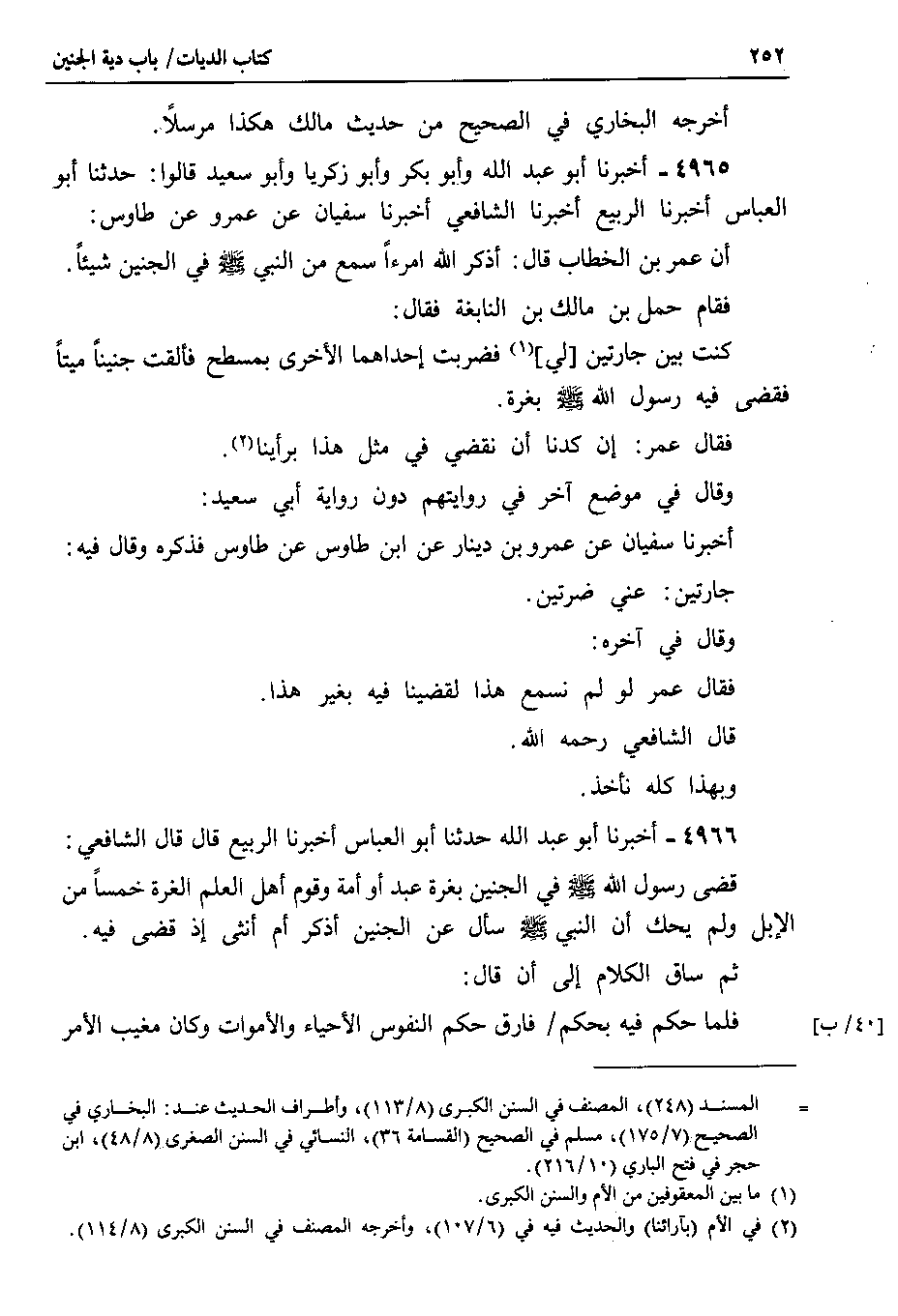 4965 - أخبرنا أبو عبد الله وأبو بكر وأبو زكريا وأبو سعيد قالوا : حدثنا أبو العباس أخبرنا الربيع أخبرنا الشافعي أخبرنا سفيان عن عمرو عن طاووس : أن عمر بن الخطاب قال : أذكر الله امرءاً سمع من النبي صلى الله عليه وسلم في الجنين شيئاً.