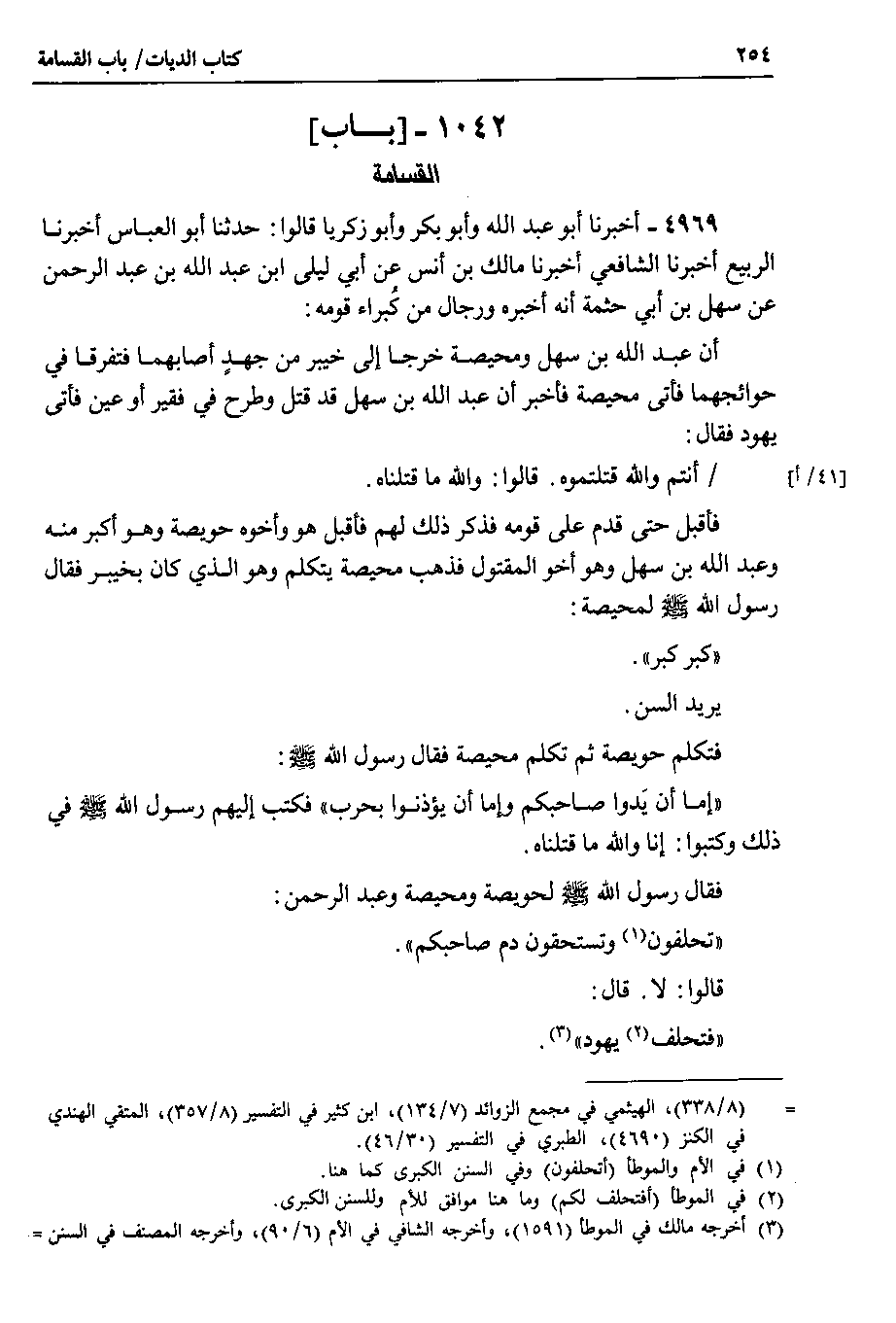 4969 - أخبرنا أبو عبد الله وأبو بكر وأبو زكريا قالوا : حدثنا أبو العباس أخبرنا الربيع أخبرنا الشافعي أخبرنا مالك بن أنس عن أبي ليلى ابن عبد الله بن عبد الرحمن عن سهل بن أبي حثمة أنه أخبره ورجال من كُبراء قومه : أن عبد الله بن سهل ومحيصة خرجا إلى خيبر من جهدٍ أصابهما فتفرقا في حوائجهما فأتى محيصة فأخبر أن عبد الله بن سهل قد قتل وطرح في فقير أو عين فأتى يهود فقال : أنتم والله قتلتموه . قالوا : والله ما قتلناه.